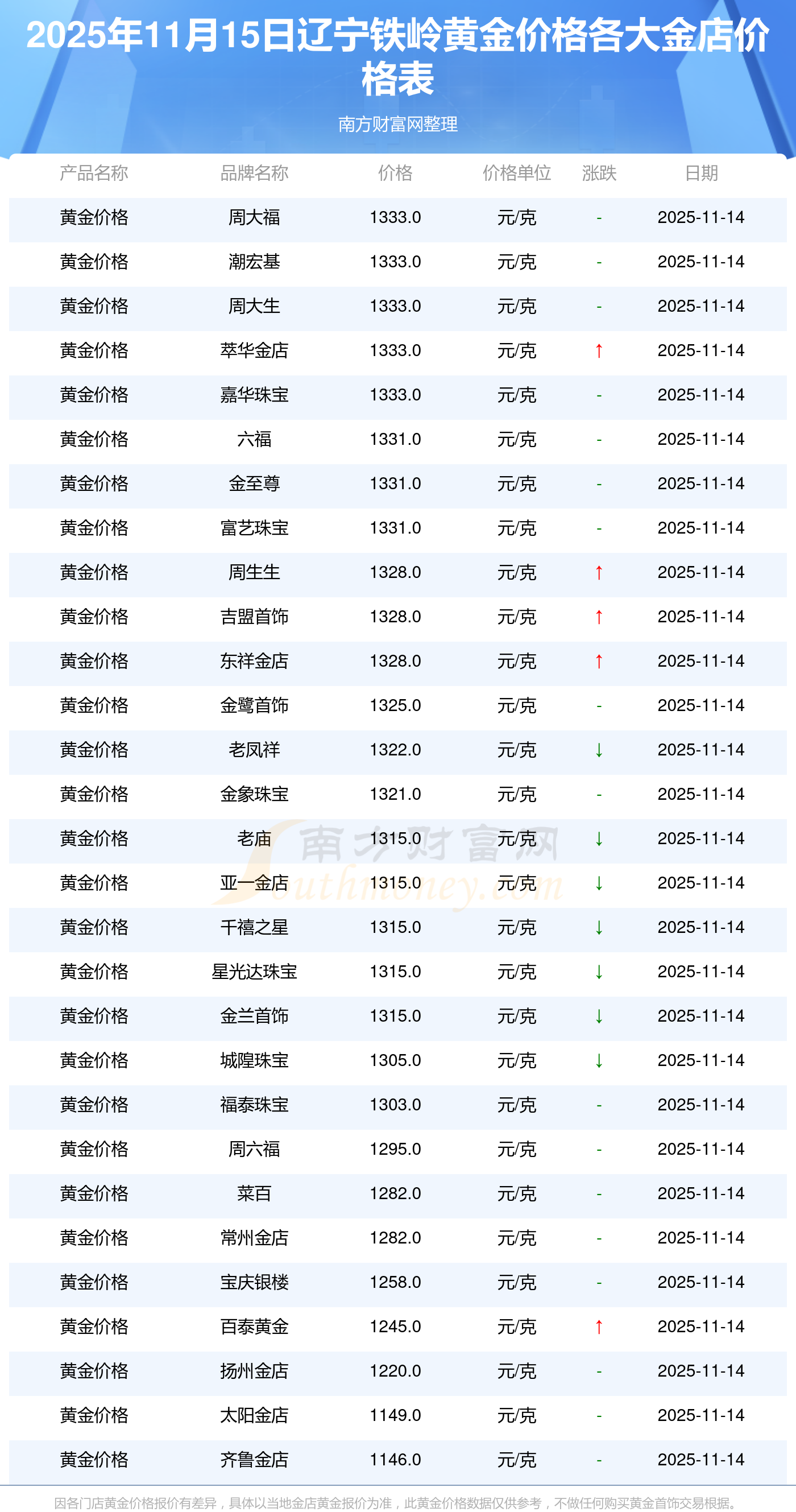 2025年11月15日遼寧鐵嶺各大金店黃金價(jià)格最新價(jià)格查詢來了:周大福1333.0元/克,周大福646.0元/克,周大福1333.0元/克,周大福46320.0,周大福18410.0,周大福41780.0,周大福1167.0元/克,老鳳祥1322.0元/克,老鳳祥600.0元/克,老鳳祥1322.0元/克,周六福1295.0元/克。