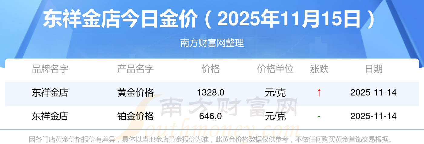 2025年11月15日各大金店黃金價格最新價格:周大福1333.0元/克,周大福646.0元/克,周大福1333.0元/克,周大福46320.0,周大福18410.0,周大福41780.0,周大福1167.0元/克,老鳳祥1322.0元/克,老鳳祥600.0元/克,老鳳祥1322.0元/克,周六福1295.0元/克。