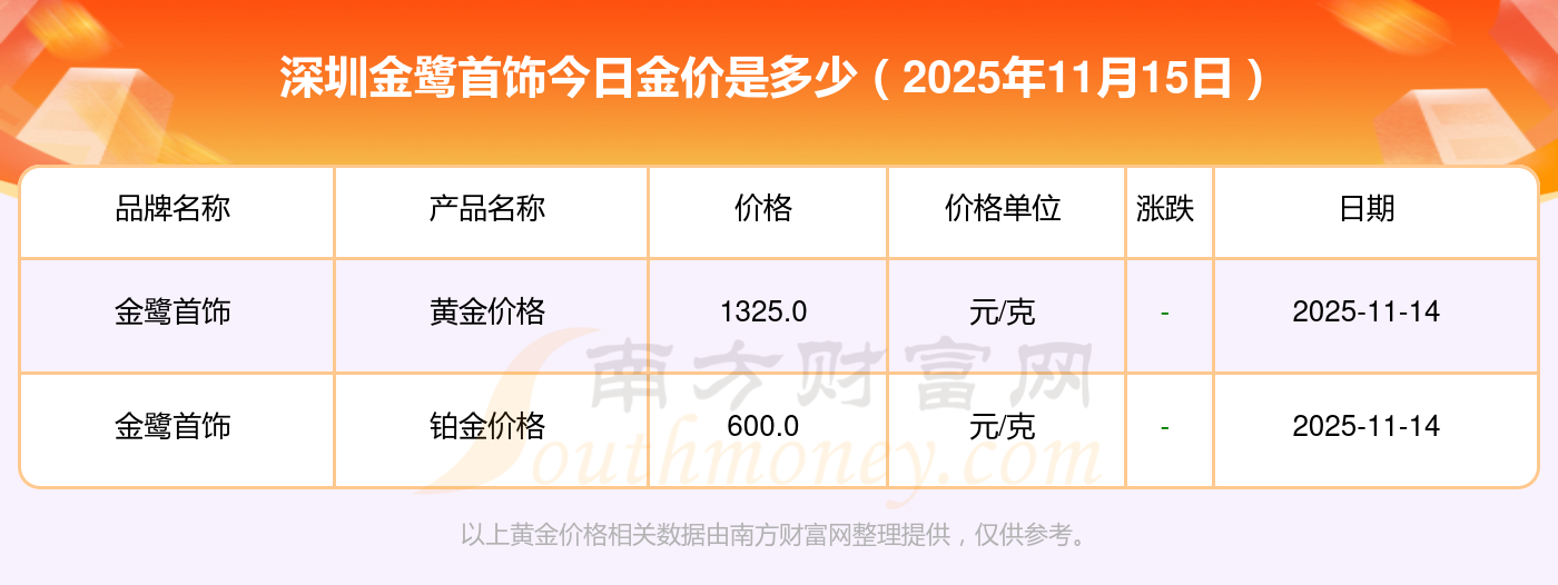 2025年11月15日深圳金鷺首飾現(xiàn)在黃金一克要多少錢:黃金價(jià)格1333.0元/克,鉑金價(jià)格646.0元/克,飾品金價(jià)(內(nèi)地)1333.0元/克,黃金飾品(香港)46320.0,鉑金價(jià)格(香港)18410.0,金條價(jià)格(香港)41780.0,金條金價(jià)(內(nèi)地)1167.0元/克,黃金價(jià)格1322.0元/克,鉑金價(jià)格600.0元/克,足金價(jià)格1322.0元/克,黃金價(jià)格1295.0元/克。