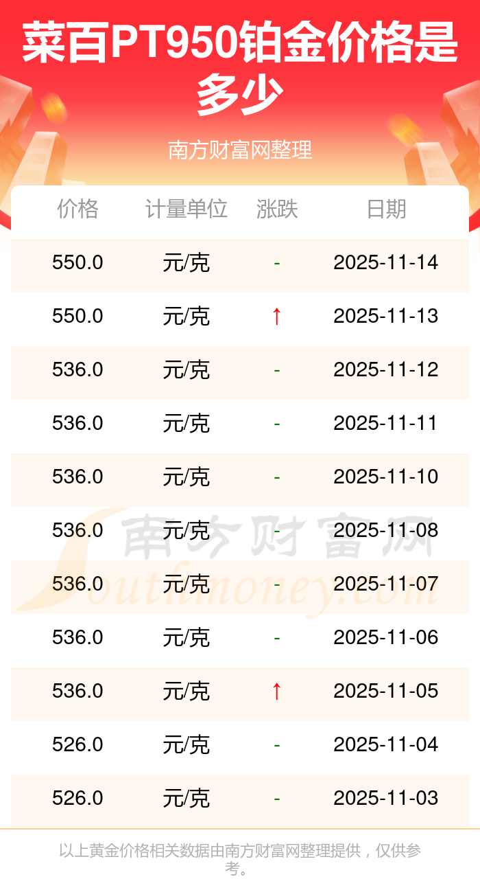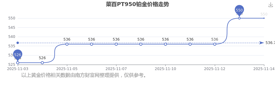 據(jù)了解,菜百今日PT950鉑金價格為550.0元/克。