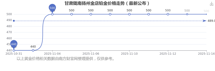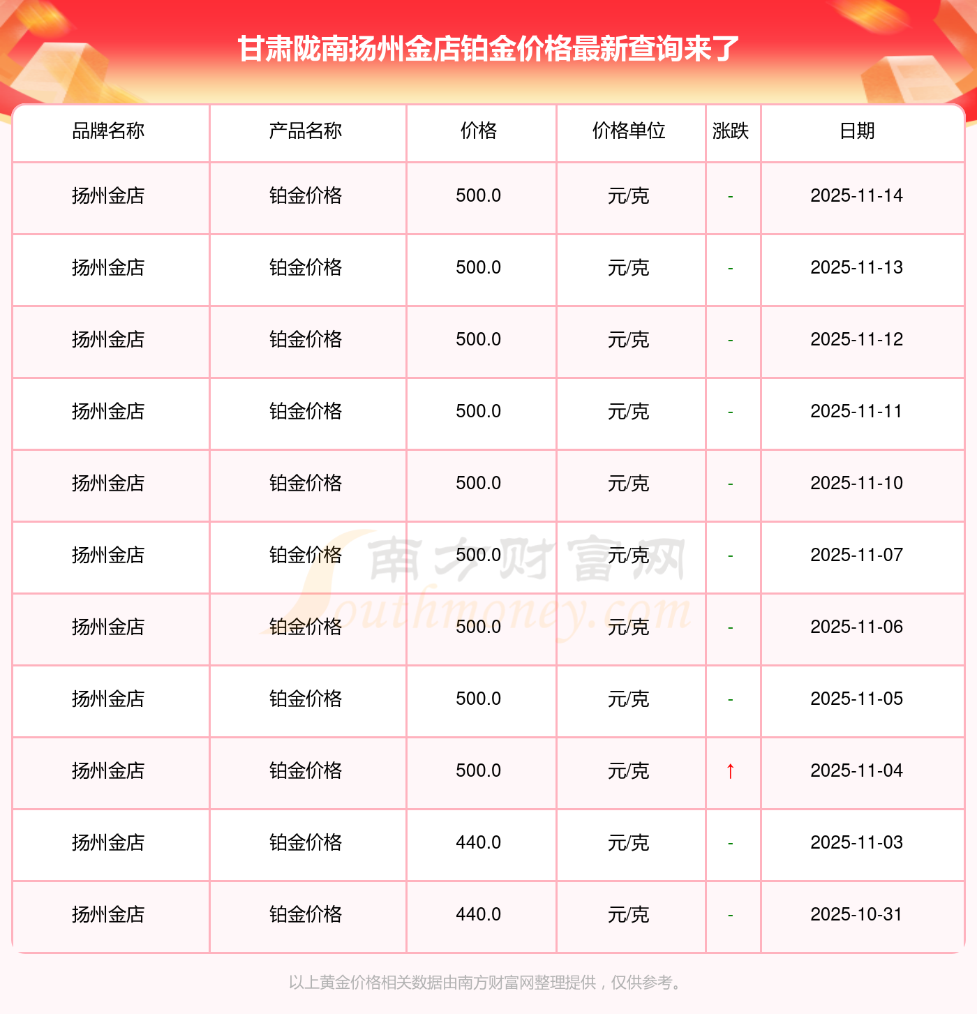 今日(2025年11月15日),甘肅隴南揚(yáng)州金店鉑金價(jià)格:500.0元/克。