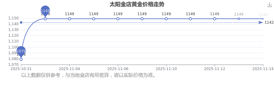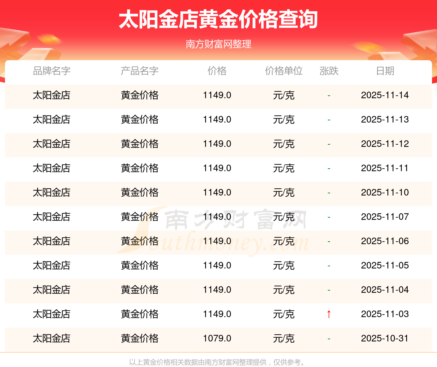 今日黃金價格查詢_現(xiàn)在金價黃金一克多少錢,黃金價格是多少錢一克?黃金每克的價格通常在什么范圍呢?2025年11月15日太陽金店黃金價格:1149.0元/克。