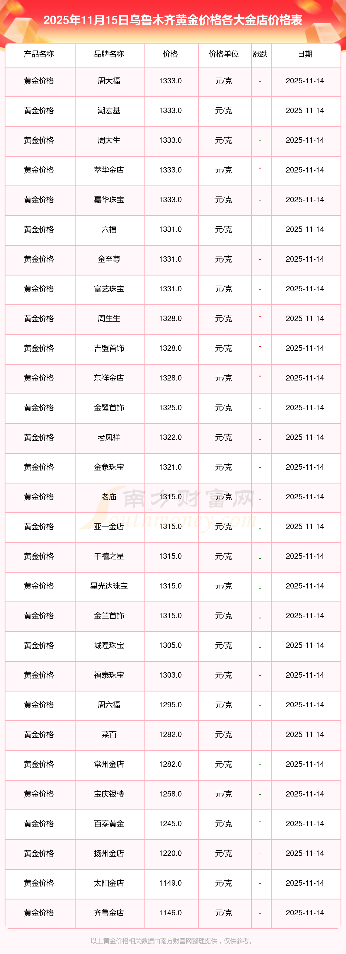 2025年11月15日,烏魯木齊周大福、周大福、周大福、周大福、周大福、周大福、周大福、老鳳祥、老鳳祥、老鳳祥、周六福等各大金店品牌黃金價格今日價格如下:周大福1333.0元/克、周大福646.0元/克、周大福1333.0元/克、周大福46320.0、周大福18410.0、周大福41780.0、周大福1167.0元/克、老鳳祥1322.0元/克、老鳳祥600.0元/克、老鳳祥1322.0元/克、周六福1295.0元/克。