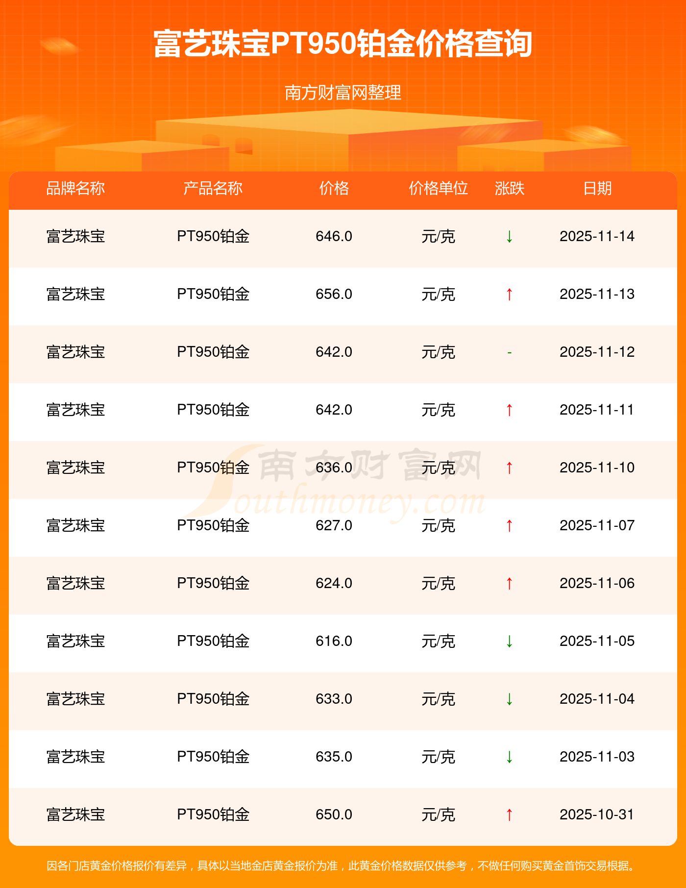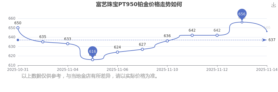 據(jù)了解,富藝珠寶今日PT950鉑金價(jià)格為646.0元/克。