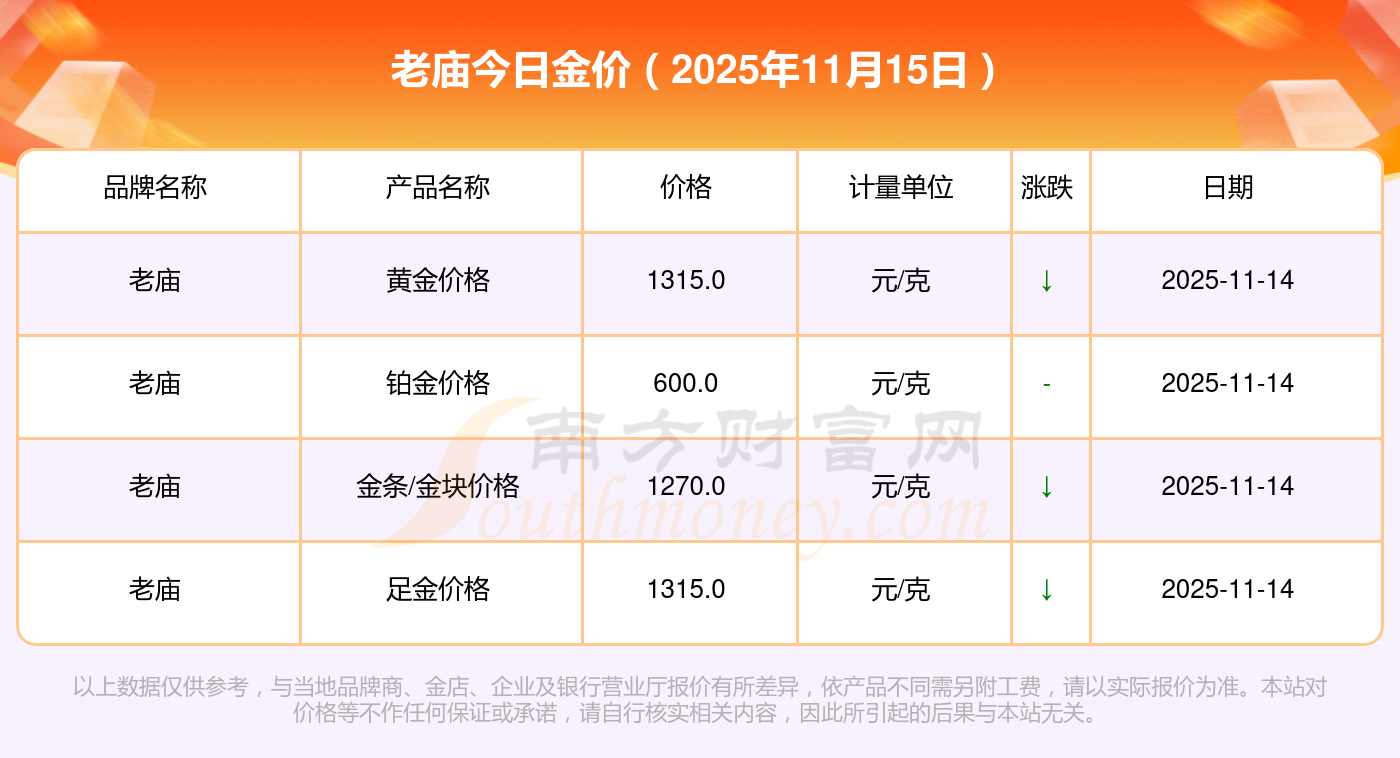 2025年11月15日老廟最新價(jià)格:黃金價(jià)格1333.0元/克,鉑金價(jià)格646.0元/克,飾品金價(jià)(內(nèi)地)1333.0元/克,黃金飾品(香港)46320.0,鉑金價(jià)格(香港)18410.0,金條價(jià)格(香港)41780.0,金條金價(jià)(內(nèi)地)1167.0元/克,黃金價(jià)格1322.0元/克,鉑金價(jià)格600.0元/克,足金價(jià)格1322.0元/克,黃金價(jià)格1295.0元/克。