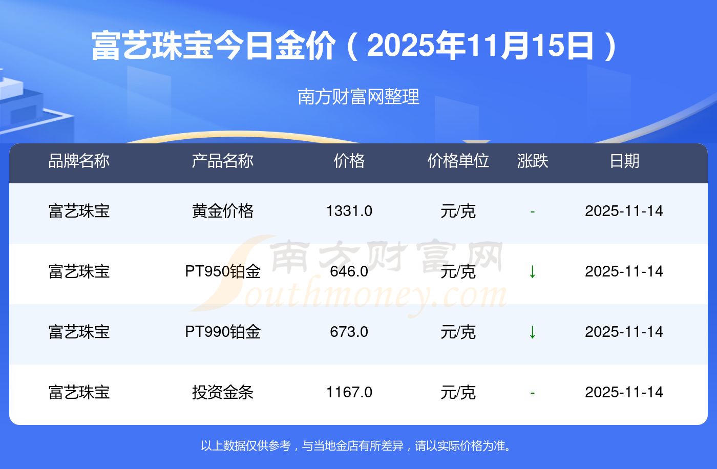 今天是2025年11月15日,周大福、周大福、周大福、周大福、周大福、周大福、周大福、老鳳祥、老鳳祥、老鳳祥、周六福等各大金店品牌黃金價(jià)格最新價(jià)格如下:周大福1333.0元/克、周大福646.0元/克、周大福1333.0元/克、周大福46320.0、周大福18410.0、周大福41780.0、周大福1167.0元/克、老鳳祥1322.0元/克、老鳳祥600.0元/克、老鳳祥1322.0元/克、周六福1295.0元/克。