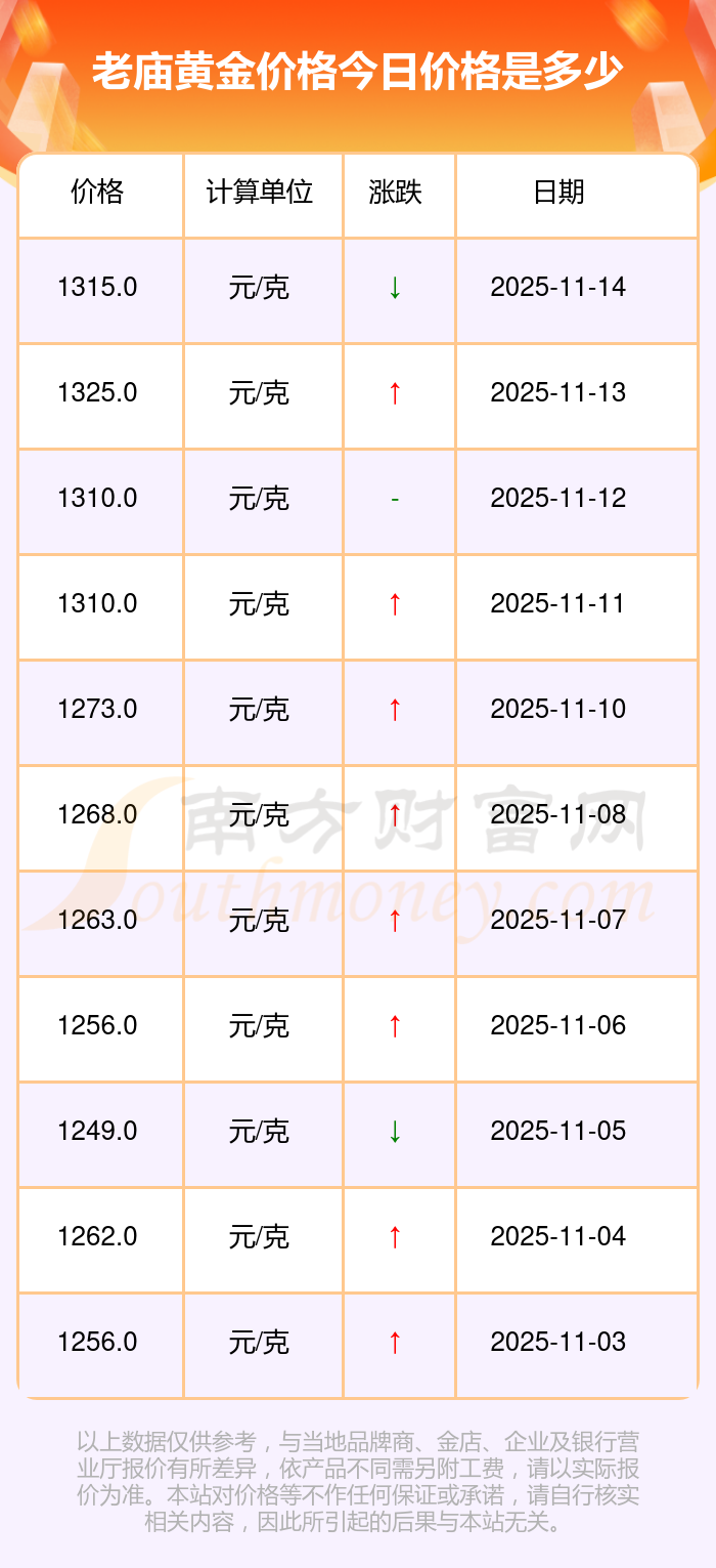 今日老廟 黃金價(jià)格最新的市場標(biāo)價(jià)為1315.0元/克。