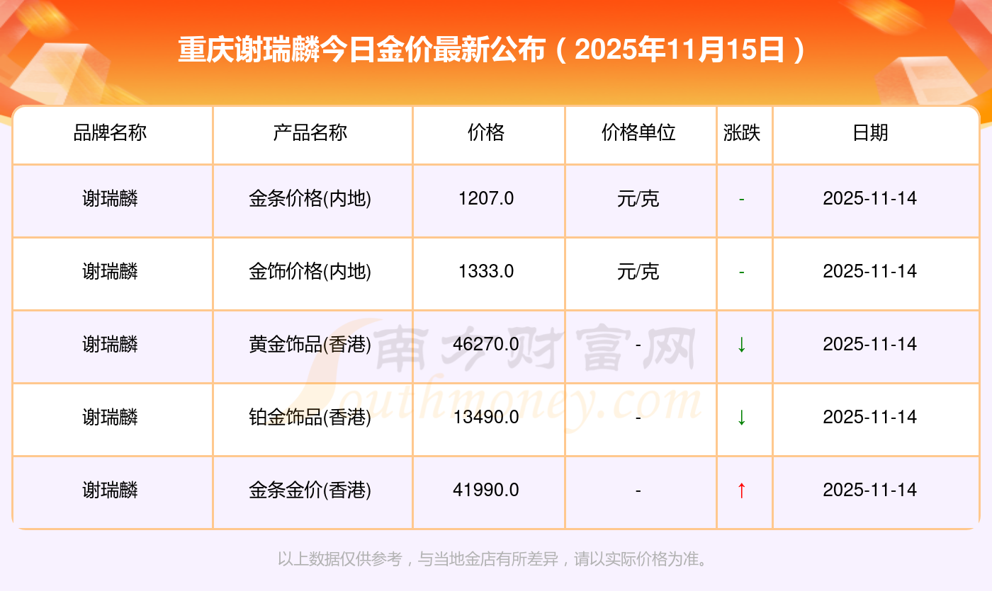 2025年11月15日重慶謝瑞麟黃金按克計(jì)價(jià),現(xiàn)在多少錢一克?黃金價(jià)格1333.0元/克,鉑金價(jià)格646.0元/克,飾品金價(jià)(內(nèi)地)1333.0元/克,黃金飾品(香港)46320.0,鉑金價(jià)格(香港)18410.0,金條價(jià)格(香港)41780.0,金條金價(jià)(內(nèi)地)1167.0元/克,黃金價(jià)格1322.0元/克,鉑金價(jià)格600.0元/克,足金價(jià)格1322.0元/克,黃金價(jià)格1295.0元/克。