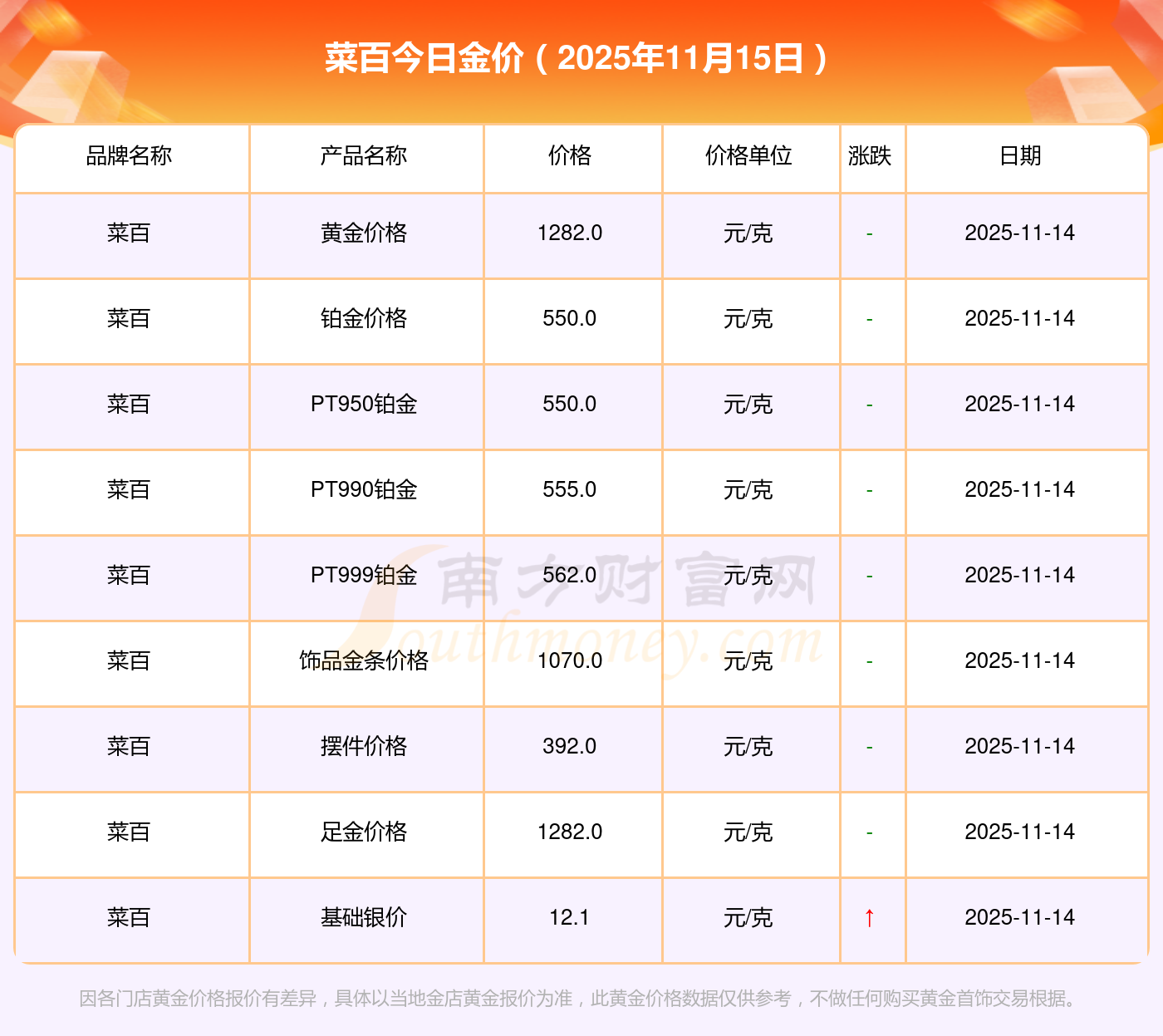 以上數(shù)據(jù)僅供參考,與當(dāng)?shù)仄放粕獭⒔鸬、企業(yè)及銀行營(yíng)業(yè)廳報(bào)價(jià)有所差異,依產(chǎn)品不同需另附工費(fèi),請(qǐng)以實(shí)際報(bào)價(jià)為準(zhǔn)。本站對(duì)價(jià)格等不作任何保證或承諾,請(qǐng)自行核實(shí)相關(guān)內(nèi)容,因此所引起的后果與本站無(wú)關(guān)。