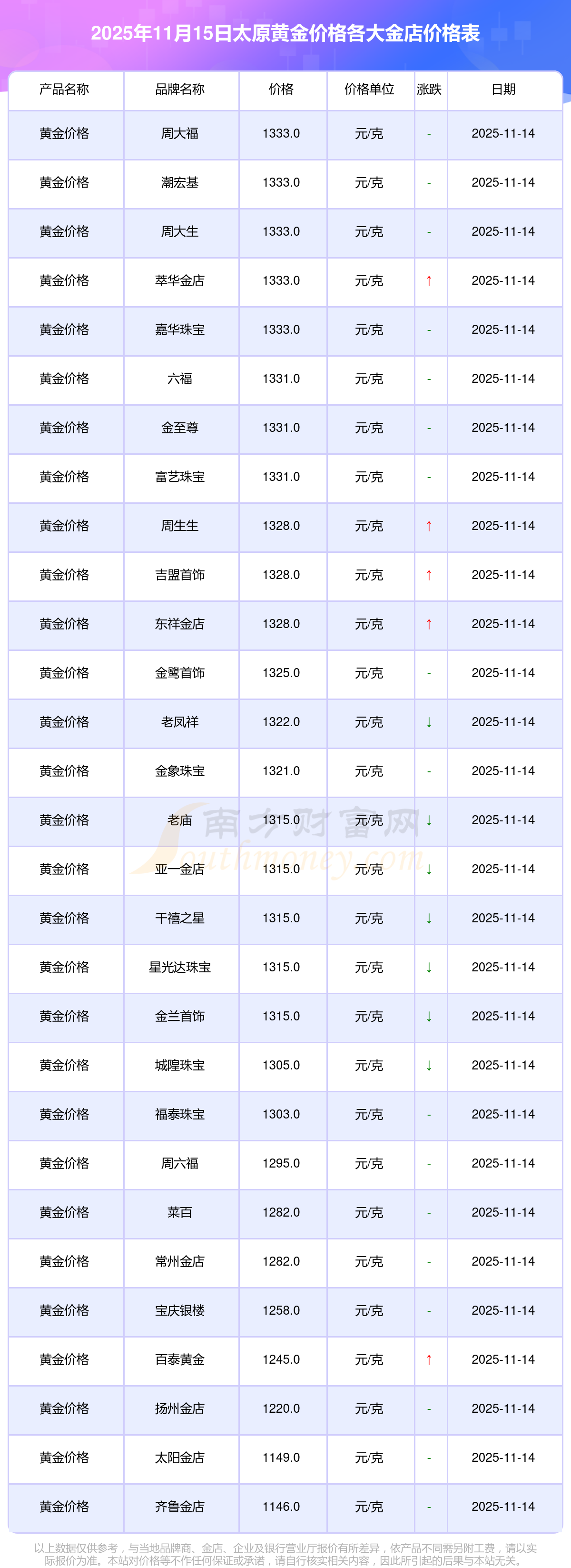 2025年11月15日太原周大福、周大福、周大福、周大福、周大福、周大福、周大福、老鳳祥、老鳳祥、老鳳祥、周六福等各大金店品牌黃金價格最新價格行情來了,如下:周大福黃金價格1333.0元/克,周大福鉑金價格646.0元/克,周大福飾品金價(內(nèi)地)1333.0元/克,周大福黃金飾品(香港)46320.0,周大福鉑金價格(香港)18410.0,周大福金條價格(香港)41780.0,周大福金條金價(內(nèi)地)1167.0元/克,老鳳祥黃金價格1322.0元/克,老鳳祥鉑金價格600.0元/克,老鳳祥足金價格1322.0元/克,周六福黃金價格1295.0元/克。