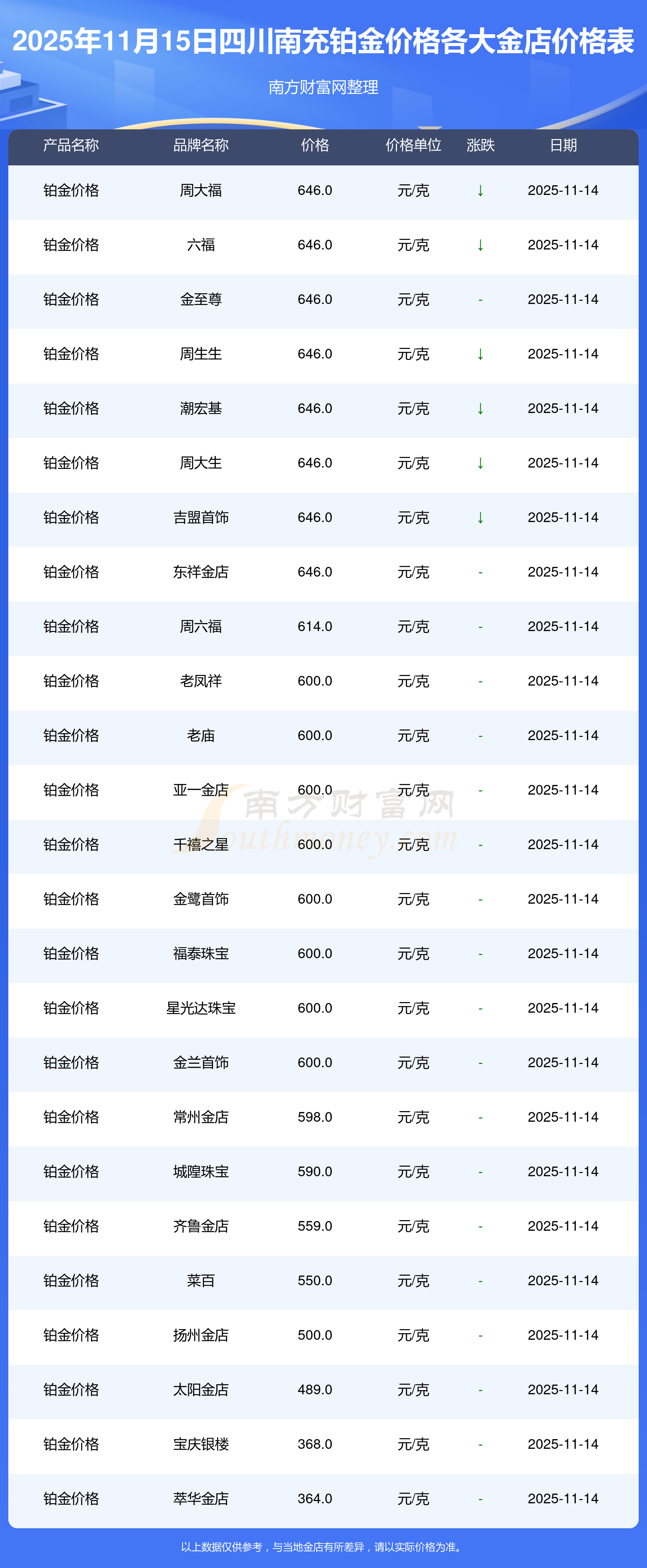 金飾在多家門(mén)店的售價(jià)是多少?2025年11月15日四川南充各金店鉑金價(jià)格表來(lái)了