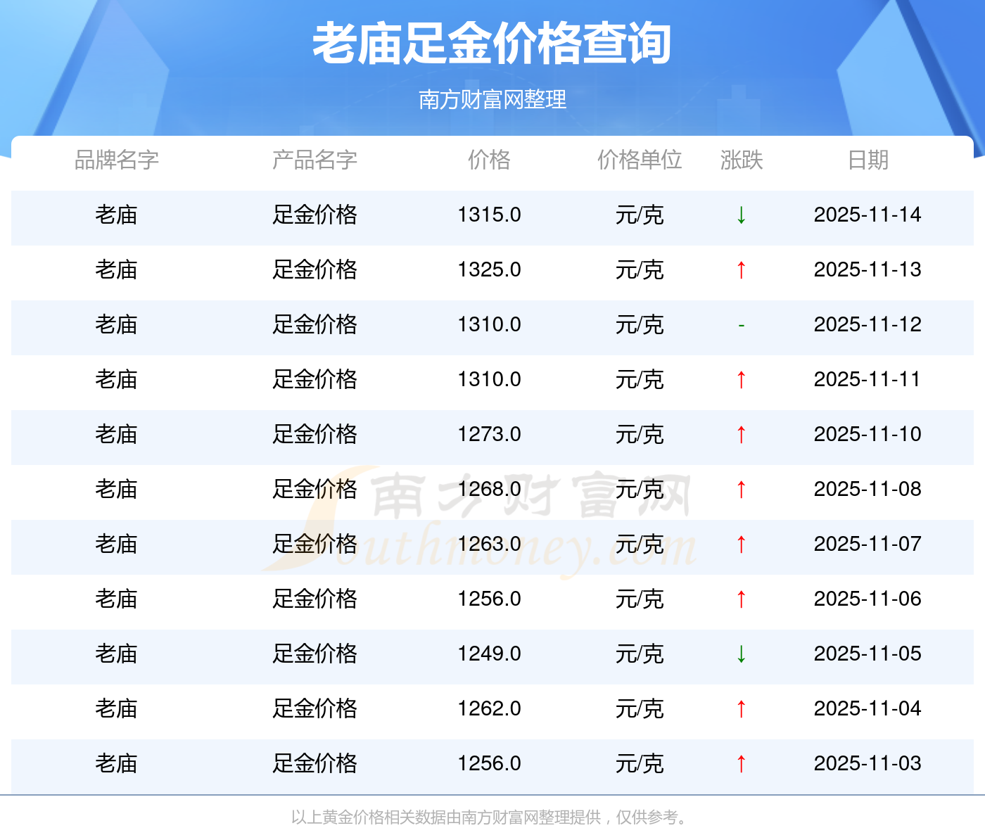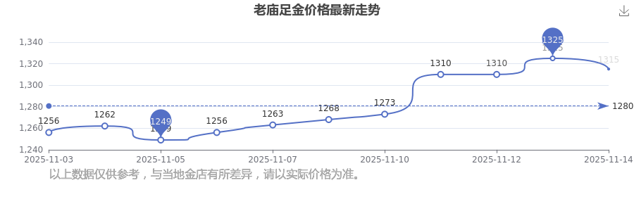今日(2025年11月15日)老廟足金價(jià)格為1315.0元/克。