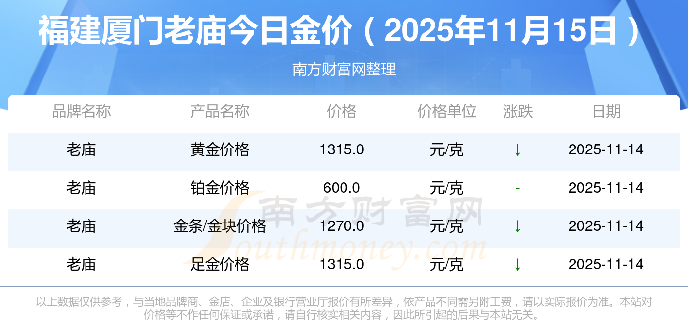 福建廈門老廟,現在一克黃金定價多少?黃金價格1333.0元/克,鉑金價格646.0元/克,飾品金價(內地)1333.0元/克,黃金飾品(香港)46320.0,鉑金價格(香港)18410.0,金條價格(香港)41780.0,金條金價(內地)1167.0元/克,黃金價格1322.0元/克,鉑金價格600.0元/克,足金價格1322.0元/克,黃金價格1295.0元/克。
