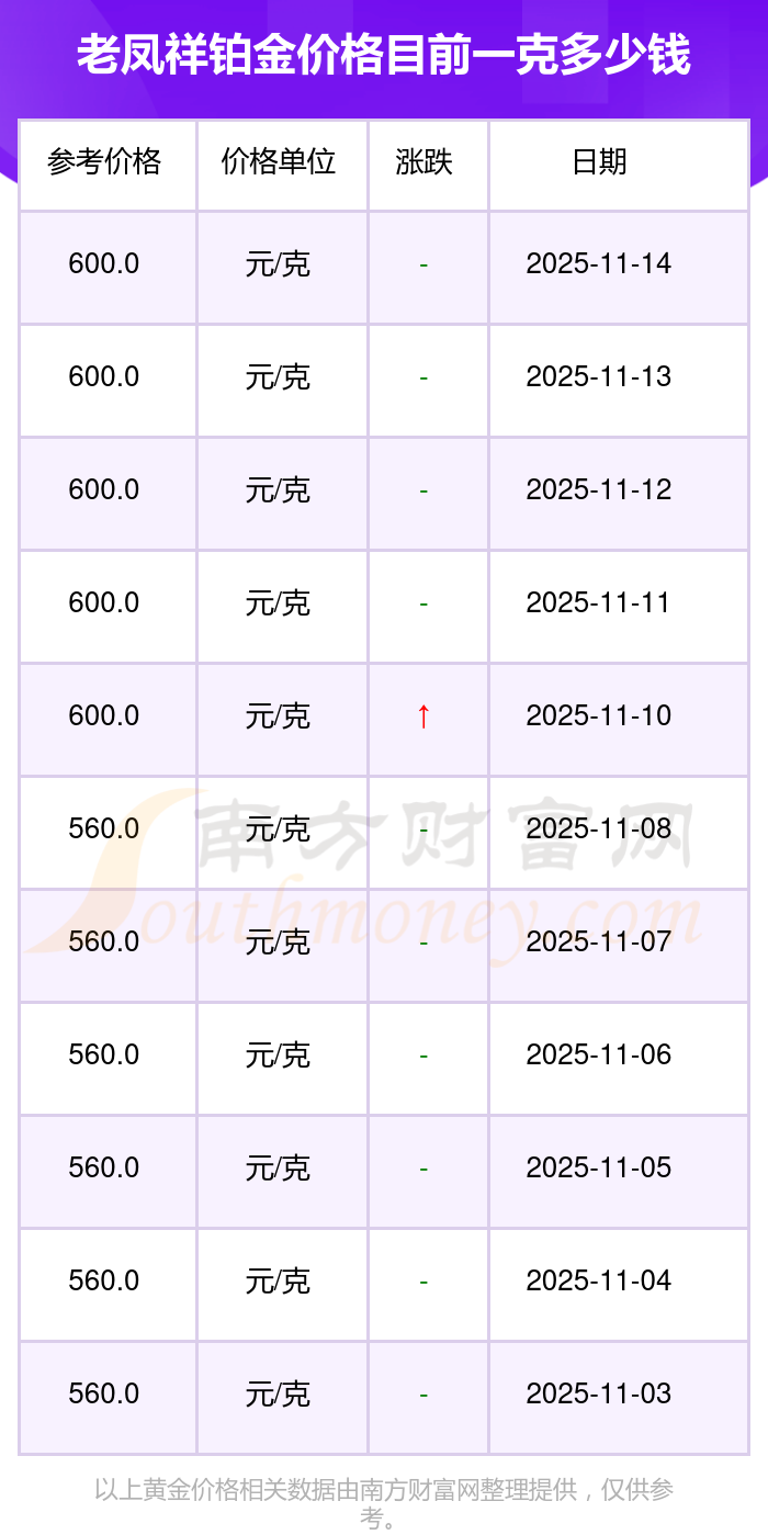 今日老鳳祥鉑金價格最新價格為600.0元/克。