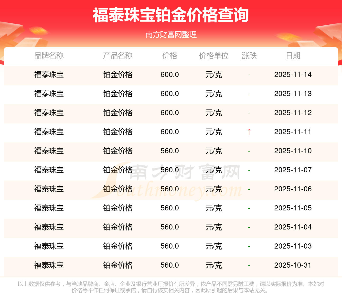 今日(2025年11月15日)福泰珠寶鉑金價(jià)格是600.0元/克。