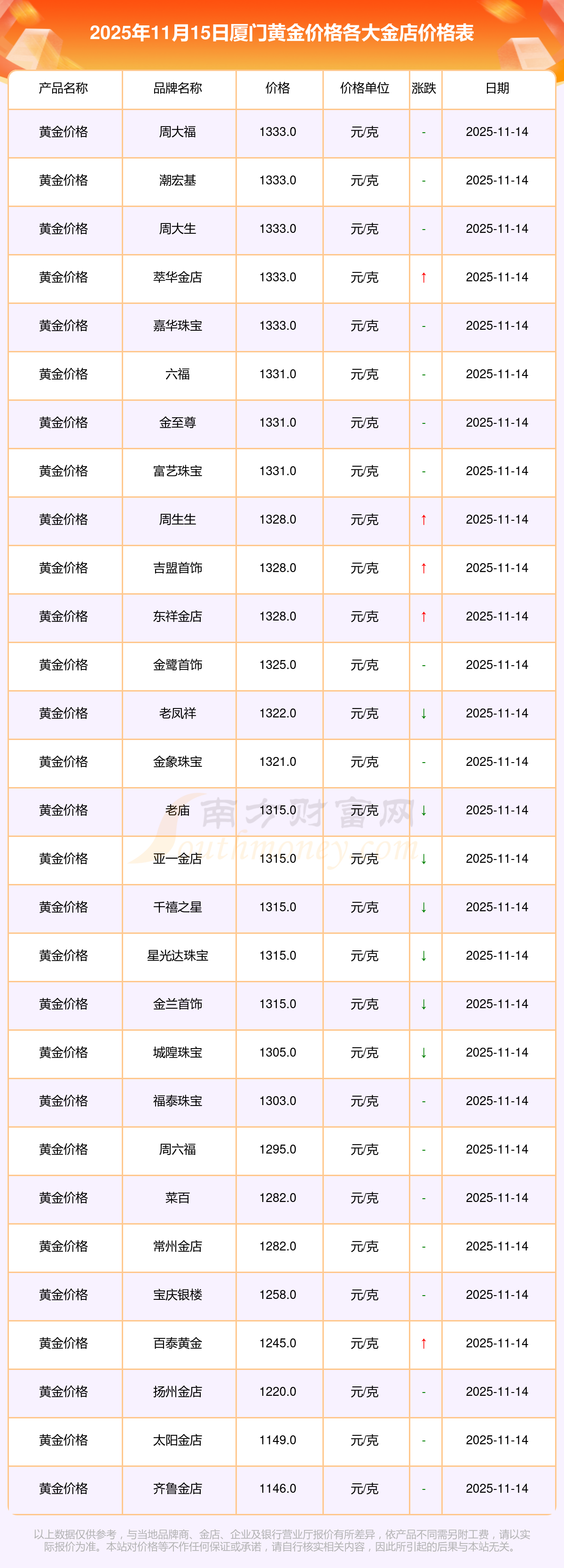 今天是2025年11月15日,廈門(mén)周大福、周大福、周大福、周大福、周大福、周大福、周大福、老鳳祥、老鳳祥、老鳳祥、周六福等各大金店品牌黃金價(jià)格最新價(jià)格如下:周大福1333.0元/克、周大福646.0元/克、周大福1333.0元/克、周大福46320.0、周大福18410.0、周大福41780.0、周大福1167.0元/克、老鳳祥1322.0元/克、老鳳祥600.0元/克、老鳳祥1322.0元/克、周六福1295.0元/克。