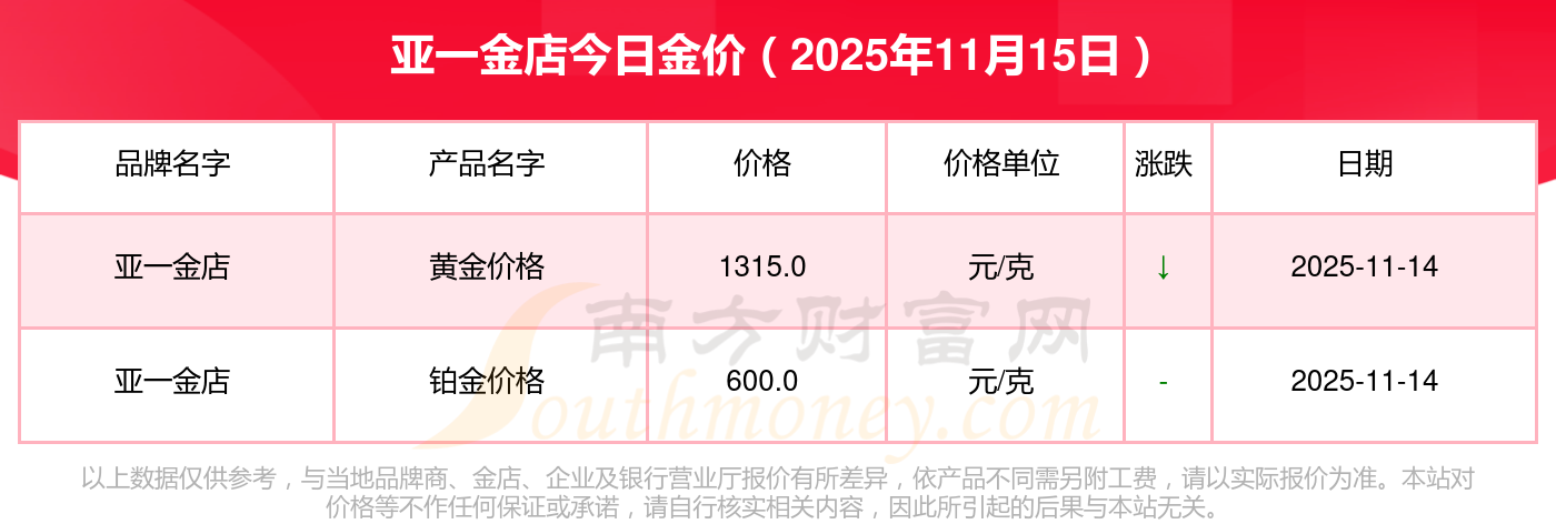 現(xiàn)在亞一金店黃金價格是多少錢1克_2025年亞一金店今日金價是多少錢一克,最新亞一金店查詢,2025年11月15日亞一金店鉑金價格現(xiàn)在每克多少錢?最新亞一金店鉑金價格報價公布,一起來看看吧!