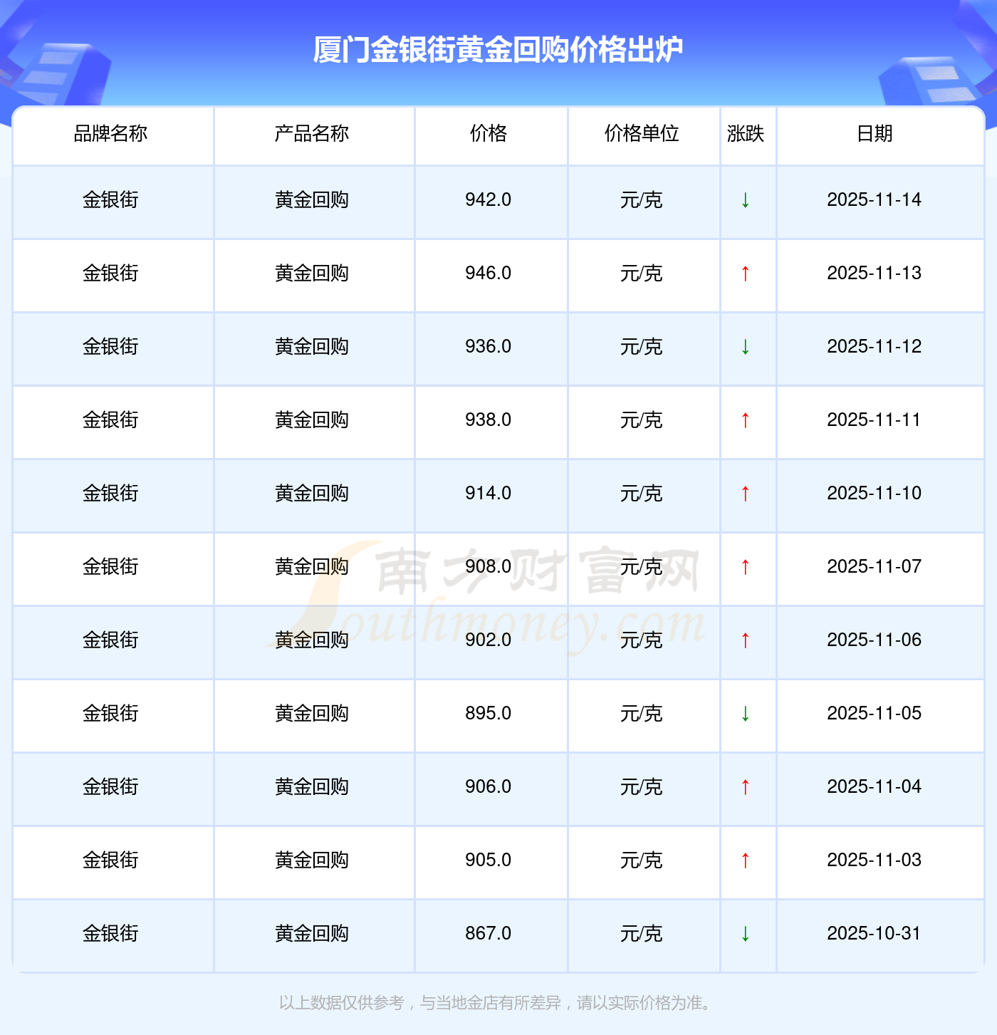 2025年11月15日,廈門金銀街的黃金回購標(biāo)價(jià)達(dá)到 942.0元/克。