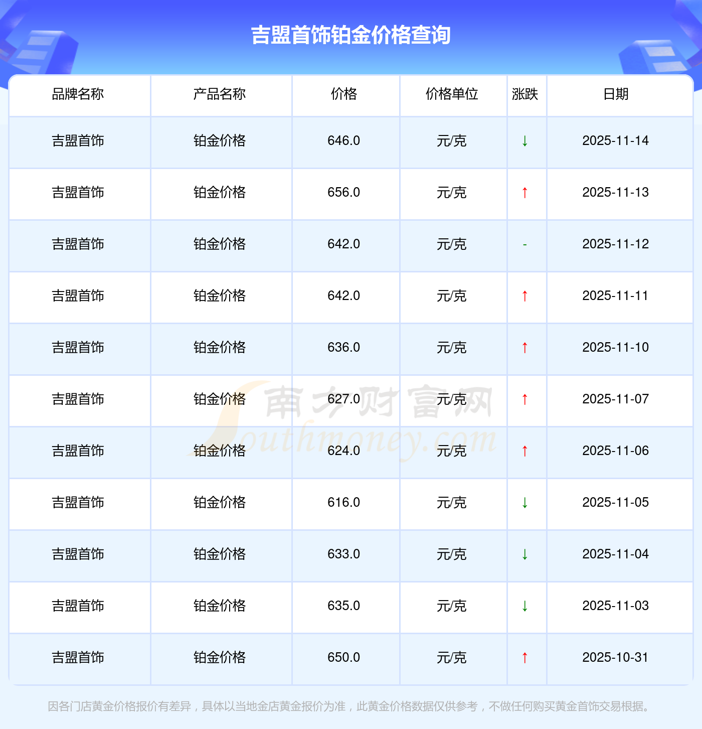 今日(2025年11月15日),吉盟首飾鉑金價(jià)格:646.0元/克。