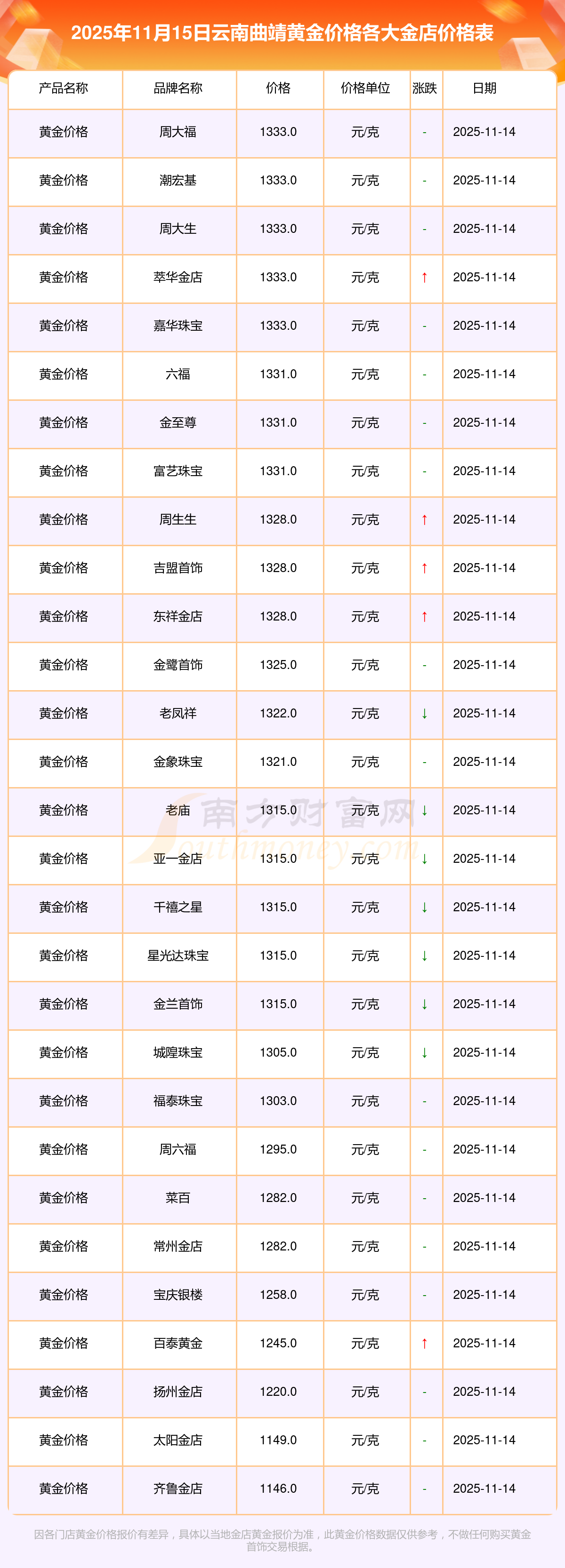 2025年11月15日,云南曲靖周大福、周大福、周大福、周大福、周大福、周大福、周大福、老鳳祥、老鳳祥、老鳳祥、周六福等各大金店品牌黃金價(jià)格今日價(jià)格行情最新來了:周大福1333.0元/克、周大福646.0元/克、周大福1333.0元/克、周大福46320.0、周大福18410.0、周大福41780.0、周大福1167.0元/克、老鳳祥1322.0元/克、老鳳祥600.0元/克、老鳳祥1322.0元/克、周六福1295.0元/克。