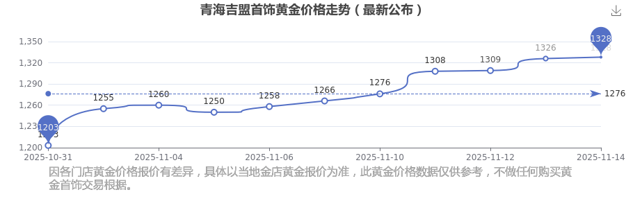 2025年11月15日,今日青海吉盟首飾黃金價(jià)格:1328.0元/克。