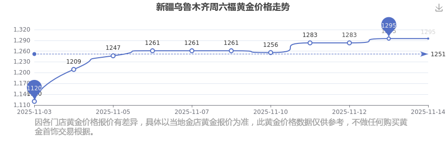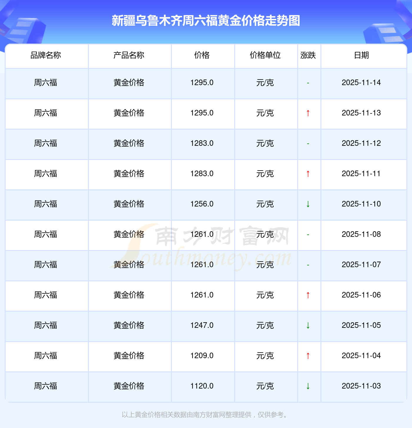 今日(2025年11月15日),新疆烏魯木齊周六福黃金價格每克的價值為1295.0元/克。