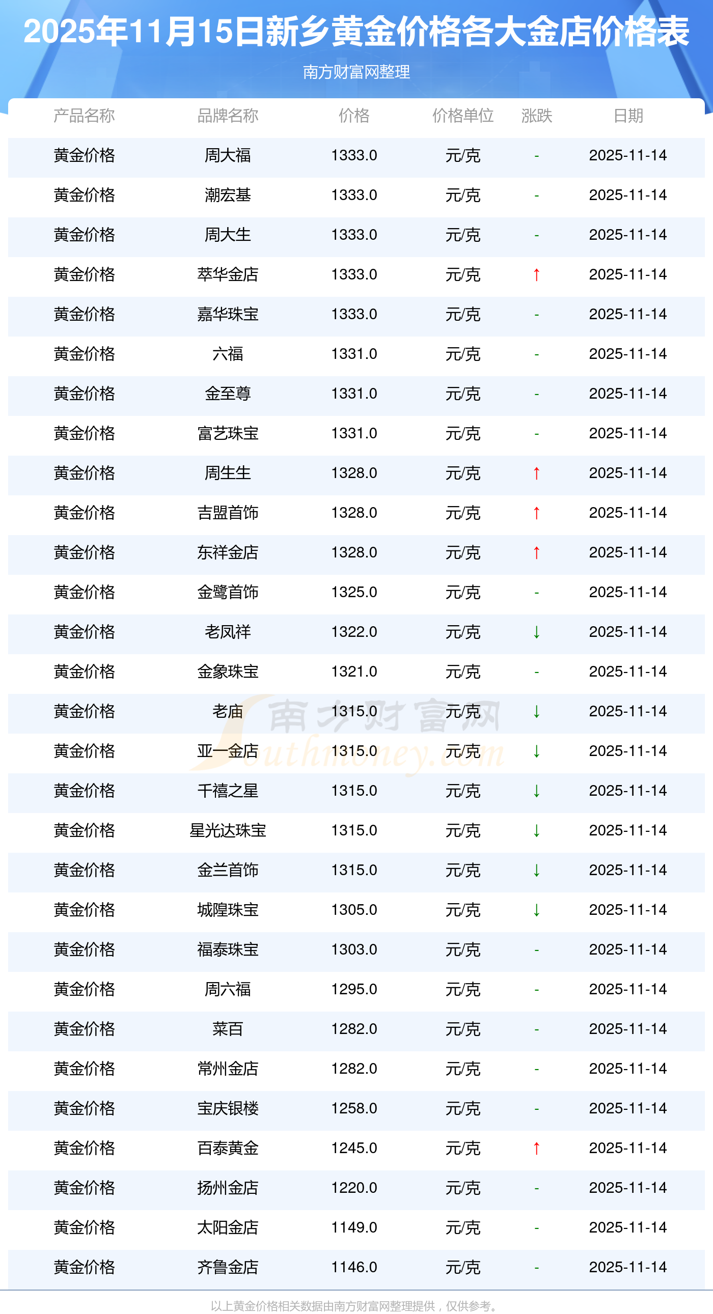 2025年11月15日,新鄉(xiāng)周大福、周大福、周大福、周大福、周大福、周大福、周大福、老鳳祥、老鳳祥、老鳳祥、周六福等各大金店品牌黃金價格今日價格行情最新來了:周大福1333.0元/克、周大福646.0元/克、周大福1333.0元/克、周大福46320.0、周大福18410.0、周大福41780.0、周大福1167.0元/克、老鳳祥1322.0元/克、老鳳祥600.0元/克、老鳳祥1322.0元/克、周六福1295.0元/克。