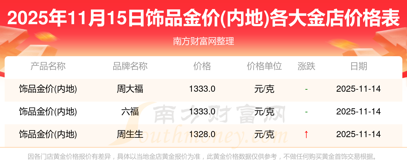 今天是2025年11月15日,周大福、周大福、周大福、周大福、周大福、周大福、周大福、老鳳祥、老鳳祥、老鳳祥、周六福等各大金店品牌飾品金價(內(nèi)地)最新價格如下:周大福1333.0元/克、周大福646.0元/克、周大福1333.0元/克、周大福46320.0、周大福18410.0、周大福41780.0、周大福1167.0元/克、老鳳祥1322.0元/克、老鳳祥600.0元/克、老鳳祥1322.0元/克、周六福1295.0元/克。
