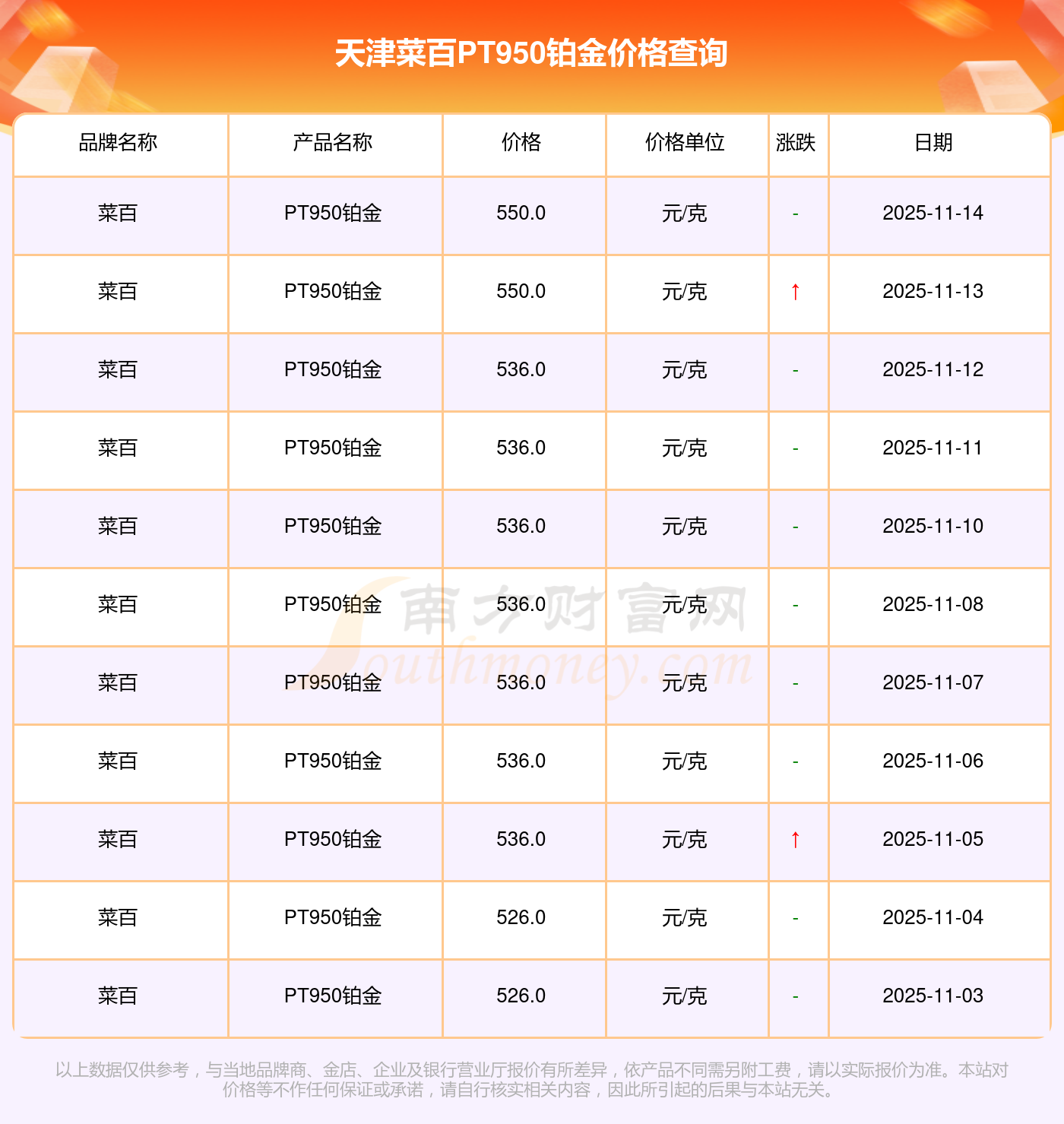 2025年11月15日各大金店P(guān)T950鉑金最新價格:周大福1333.0元/克,周大福646.0元/克,周大福1333.0元/克,周大福46320.0,周大福18410.0,周大福41780.0,周大福1167.0元/克,老鳳祥1322.0元/克,老鳳祥600.0元/克,老鳳祥1322.0元/克,周六福1295.0元/克。