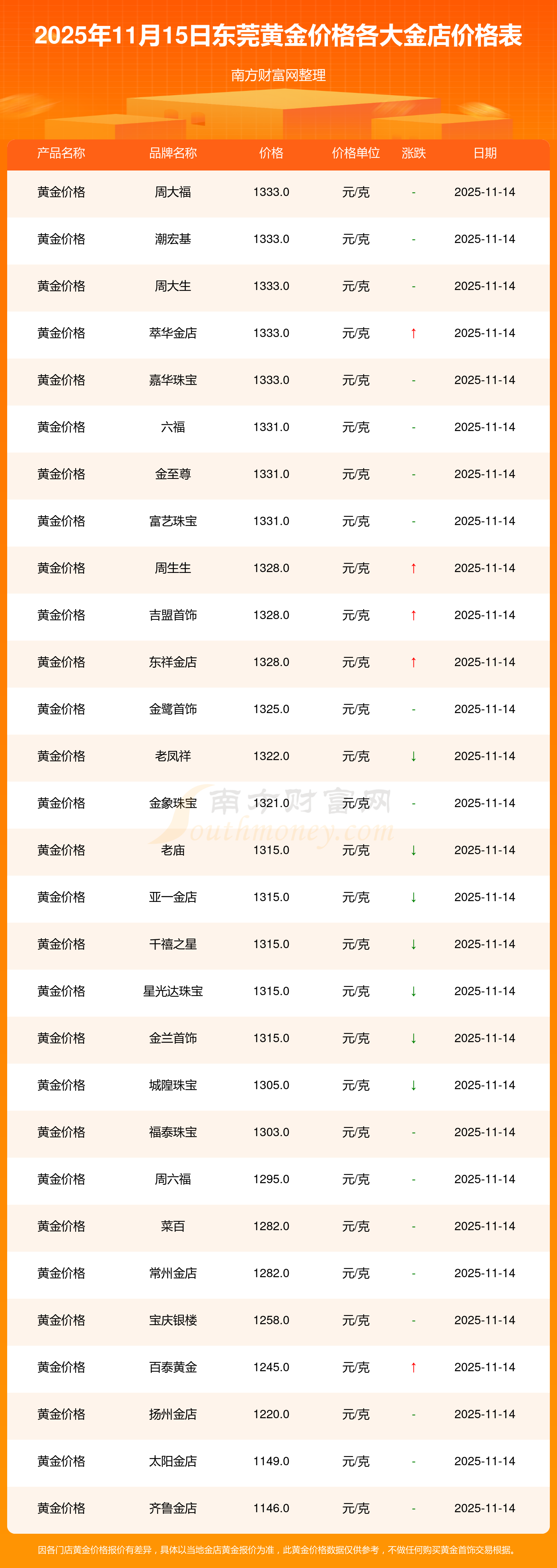 2025年11月15日東莞周大福、周大福、周大福、周大福、周大福、周大福、周大福、老鳳祥、老鳳祥、老鳳祥、周六福等各大金店品牌黃金價(jià)格最新價(jià)格如下:周大福黃金價(jià)格1333.0元/克,周大福鉑金價(jià)格646.0元/克,周大福飾品金價(jià)(內(nèi)地)1333.0元/克,周大福黃金飾品(香港)46320.0,周大福鉑金價(jià)格(香港)18410.0,周大福金條價(jià)格(香港)41780.0,周大福金條金價(jià)(內(nèi)地)1167.0元/克,老鳳祥黃金價(jià)格1322.0元/克,老鳳祥鉑金價(jià)格600.0元/克,老鳳祥足金價(jià)格1322.0元/克,周六福黃金價(jià)格1295.0元/克。
