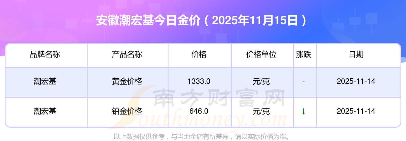 2025年11月15日安徽潮宏基黃金的單價(jià),一克為多少?黃金價(jià)格1333.0元/克,鉑金價(jià)格646.0元/克,飾品金價(jià)(內(nèi)地)1333.0元/克,黃金飾品(香港)46320.0,鉑金價(jià)格(香港)18410.0,金條價(jià)格(香港)41780.0,金條金價(jià)(內(nèi)地)1167.0元/克,黃金價(jià)格1322.0元/克,鉑金價(jià)格600.0元/克,足金價(jià)格1322.0元/克,黃金價(jià)格1295.0元/克。