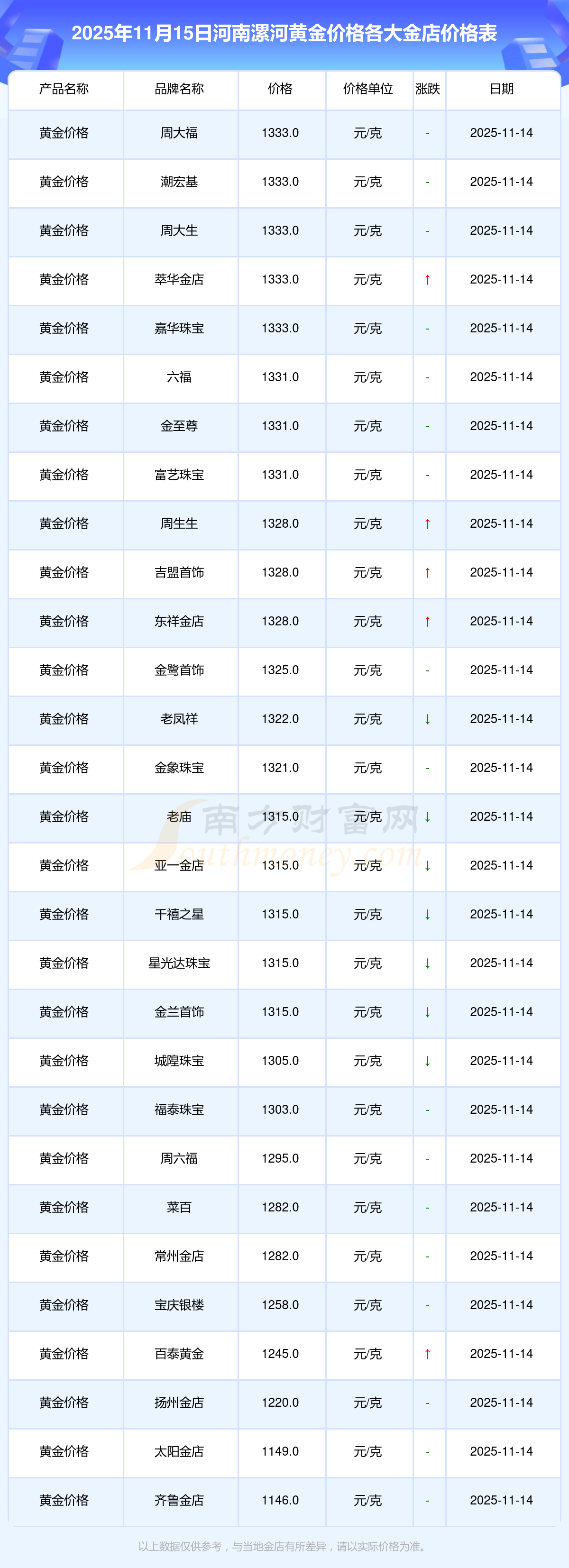 2025年11月15日河南漯河周大福、周大福、周大福、周大福、周大福、周大福、周大福、老鳳祥、老鳳祥、老鳳祥、周六福等各大金店品牌黃金價格最新價格如下:周大福黃金價格1333.0元/克,周大福鉑金價格646.0元/克,周大福飾品金價(內(nèi)地)1333.0元/克,周大福黃金飾品(香港)46320.0,周大福鉑金價格(香港)18410.0,周大福金條價格(香港)41780.0,周大福金條金價(內(nèi)地)1167.0元/克,老鳳祥黃金價格1322.0元/克,老鳳祥鉑金價格600.0元/克,老鳳祥足金價格1322.0元/克,周六福黃金價格1295.0元/克。