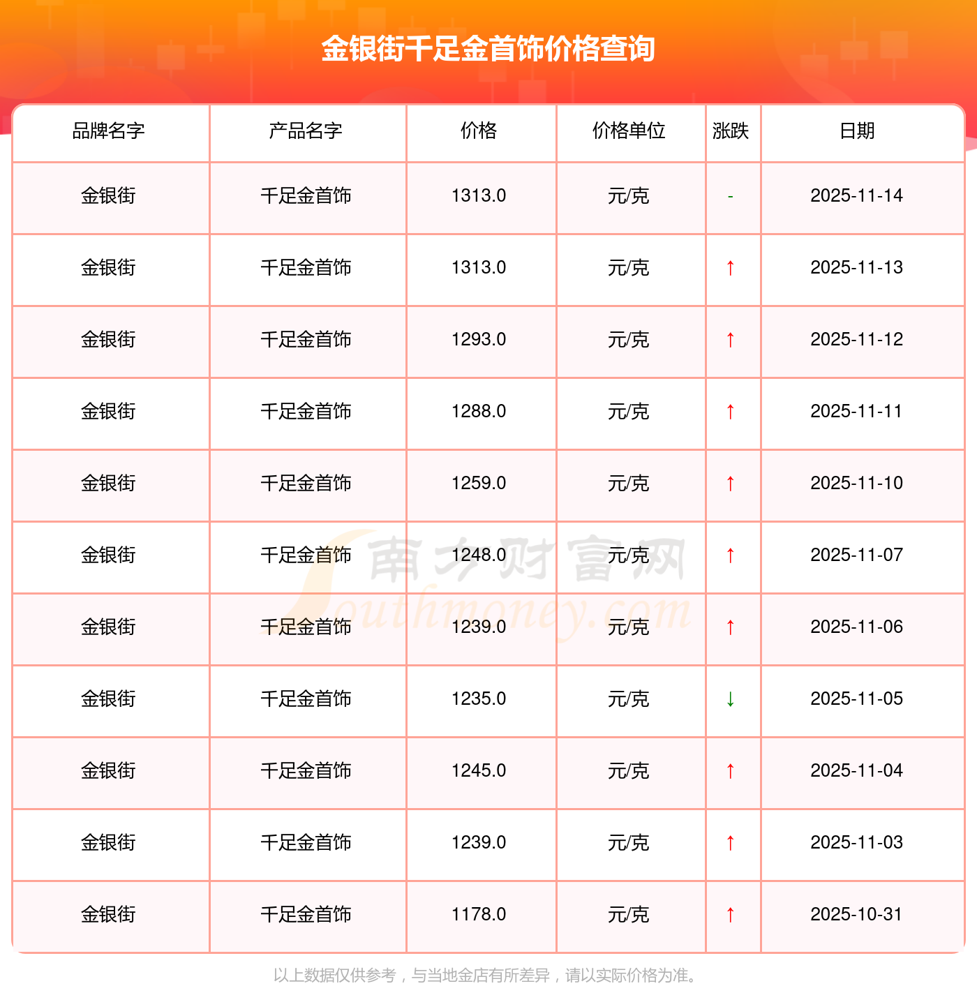 因各門店黃金價格報價有差異,具體以當?shù)亟鸬挈S金報價為準,此黃金價格數(shù)據(jù)僅供參考,不做任何購買黃金首飾交易根據(jù)。