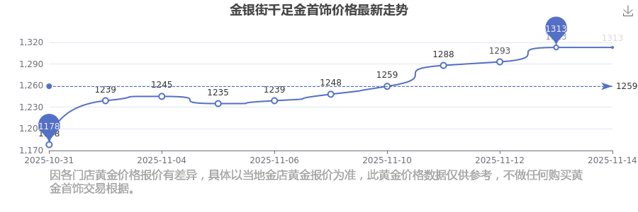 今日金銀街所公布的 千足金首飾最新價格為1313.0元/克。