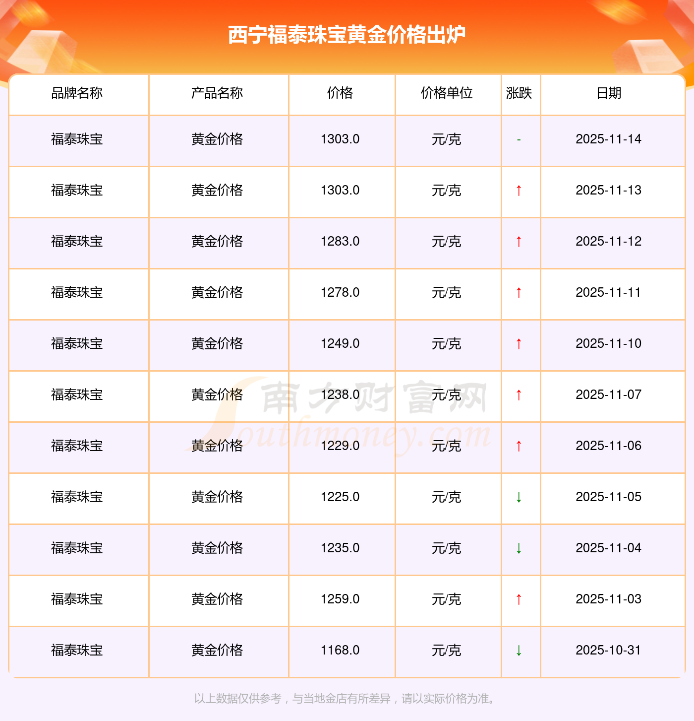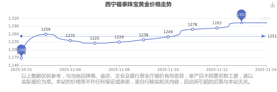 2025年11月15日,西寧福泰珠寶所售黃金價格,其價格設(shè)定為 1303.0元/克。