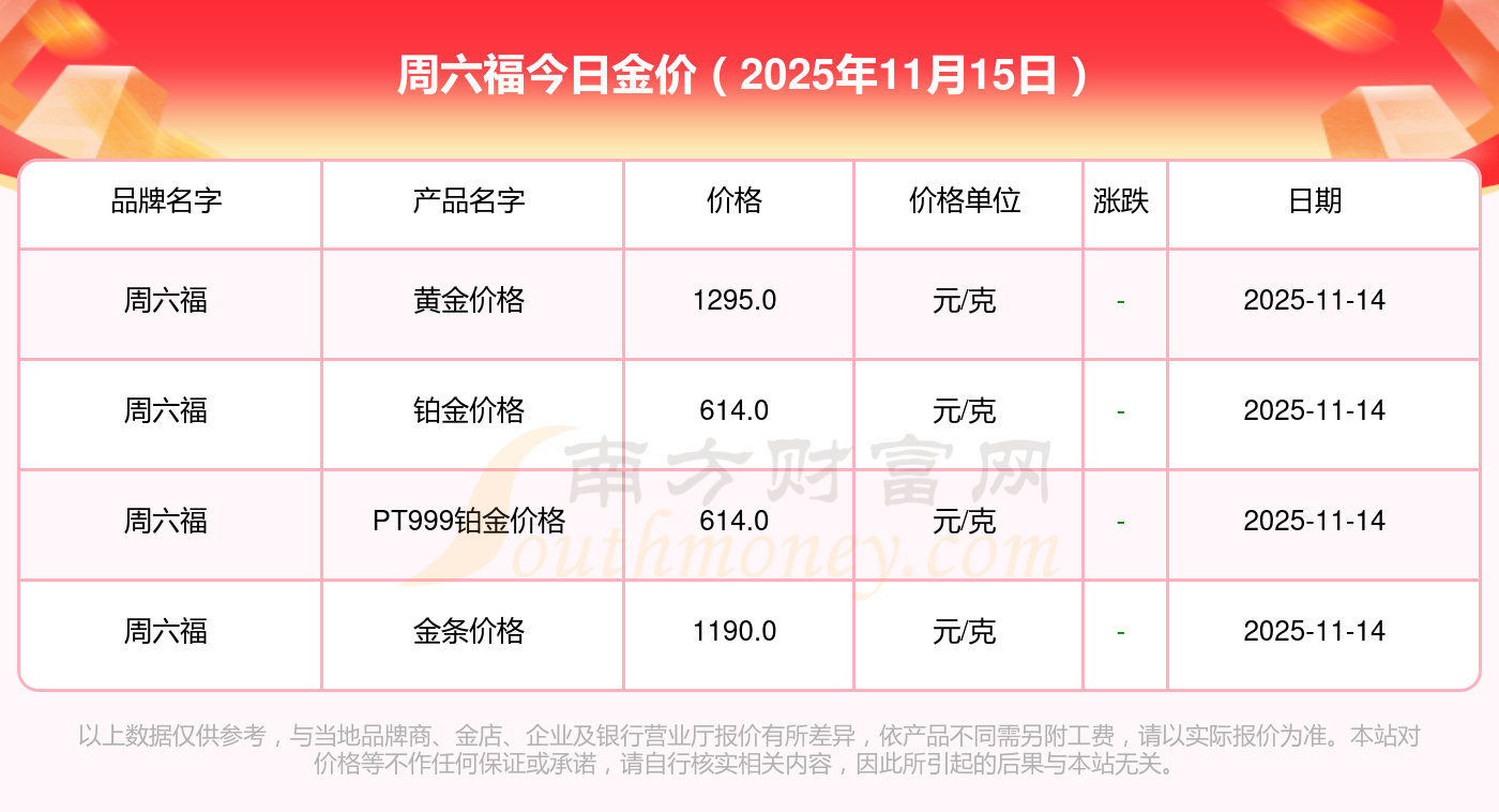 周六,F(xiàn)在金價(jià)多少錢(qián)一克?周六福今天鉑金價(jià)格多少一克?最新周六福查詢,2025年11月15日周六福鉑金價(jià)格現(xiàn)在每克多少錢(qián)?最新周六福鉑金價(jià)格報(bào)價(jià)公布,一起來(lái)看看吧!