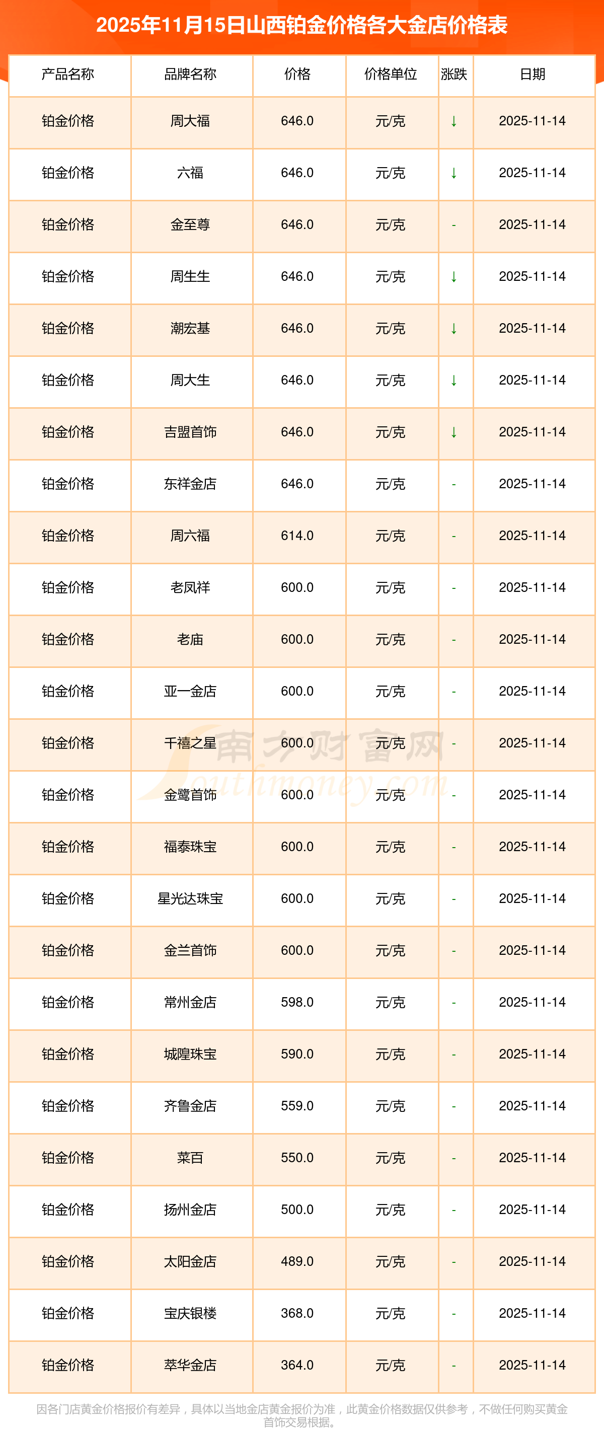 2025年11月15日,山西周大福、周大福、周大福、周大福、周大福、周大福、周大福、老鳳祥、老鳳祥、老鳳祥、周六福等各大金店品牌鉑金價(jià)格今日價(jià)格行情最新來了:周大福1333.0元/克、周大福646.0元/克、周大福1333.0元/克、周大福46320.0、周大福18410.0、周大福41780.0、周大福1167.0元/克、老鳳祥1322.0元/克、老鳳祥600.0元/克、老鳳祥1322.0元/克、周六福1295.0元/克。