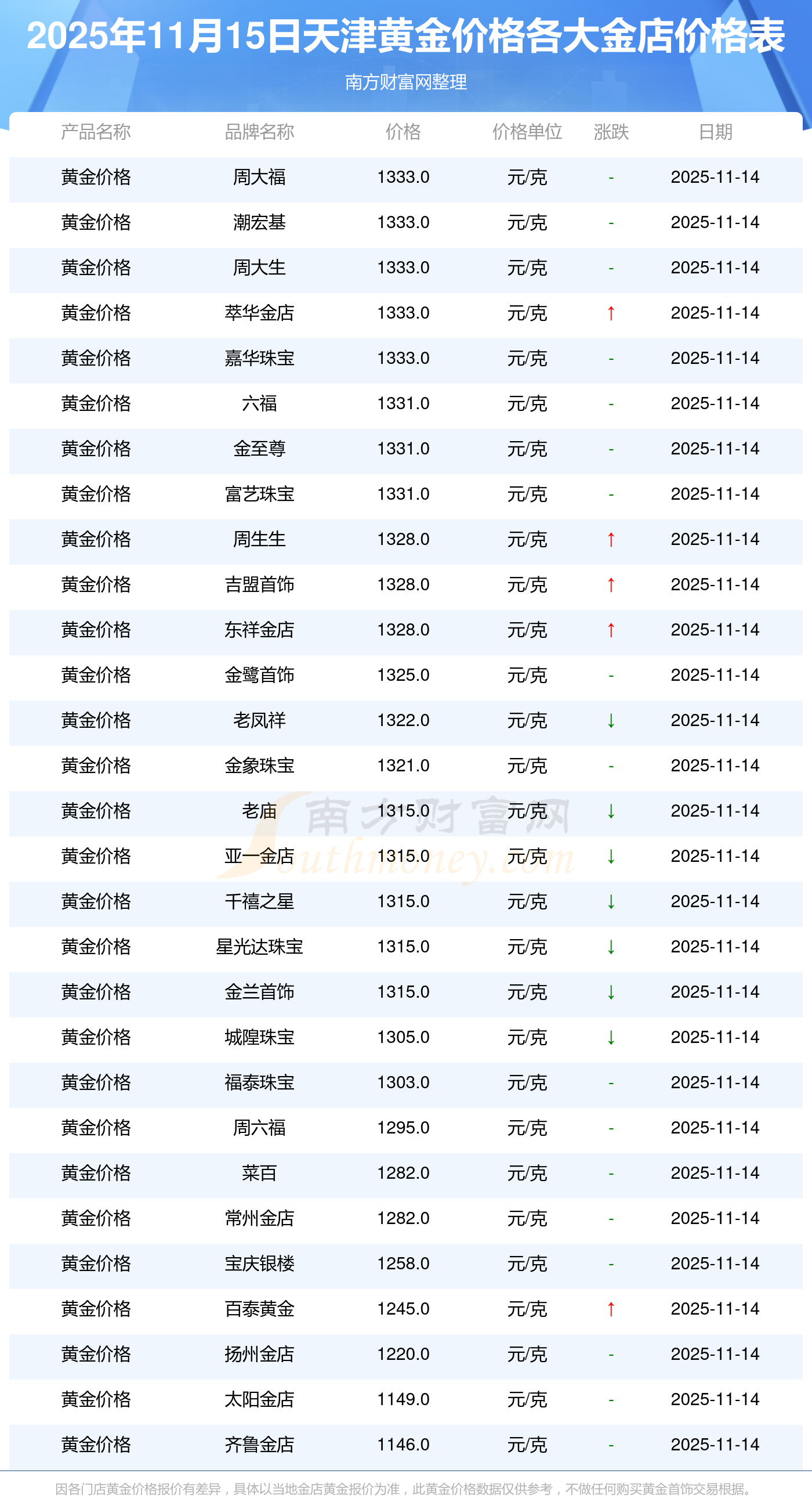 2025年11月15日天津各大金店黃金價格最新價格查詢來了:周大福1333.0元/克,周大福646.0元/克,周大福1333.0元/克,周大福46320.0,周大福18410.0,周大福41780.0,周大福1167.0元/克,老鳳祥1322.0元/克,老鳳祥600.0元/克,老鳳祥1322.0元/克,周六福1295.0元/克。