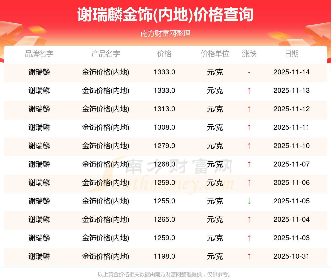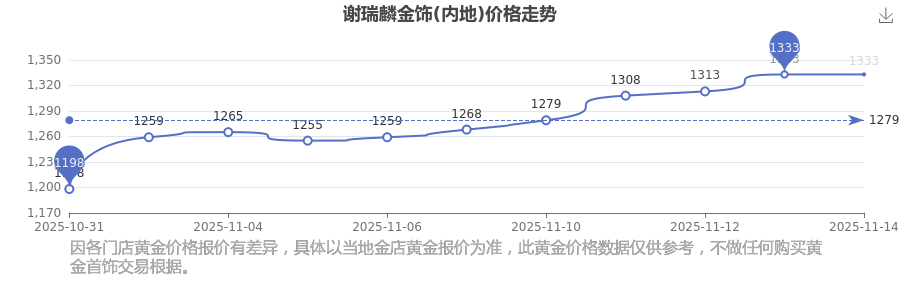 今日謝瑞麟所公布的 金飾價(jià)格(內(nèi)地)最新價(jià)格為1333.0元/克。