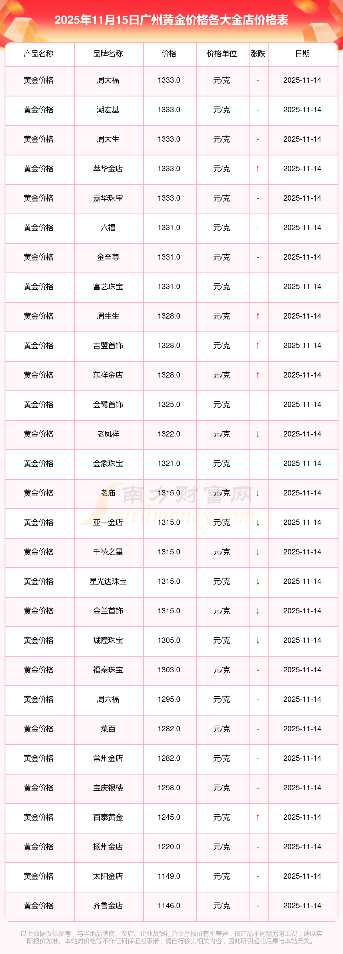 2025年11月15日廣州各大金店黃金價(jià)格最新價(jià)格:周大福1333.0元/克,周大福646.0元/克,周大福1333.0元/克,周大福46320.0,周大福18410.0,周大福41780.0,周大福1167.0元/克,老鳳祥1322.0元/克,老鳳祥600.0元/克,老鳳祥1322.0元/克,周六福1295.0元/克。