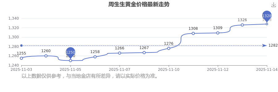 今日黃金價格具體是多少?現(xiàn)在一克黃金賣多少錢?一般而言,一克黃金的售價是多少左右?2025年11月15日周生生黃金價格為1328.0元/克。