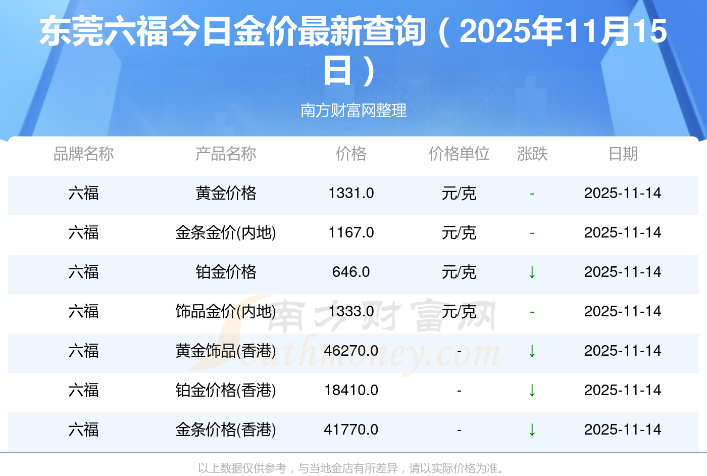 東莞六福今日金價查詢_今天報價多少一克(2025年11月15日)