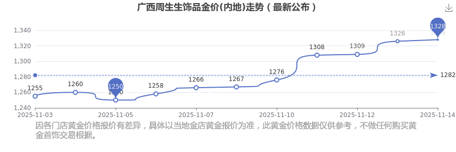 2025年11月15日廣西周生生飾品金價(內地)是1328.0元/克。