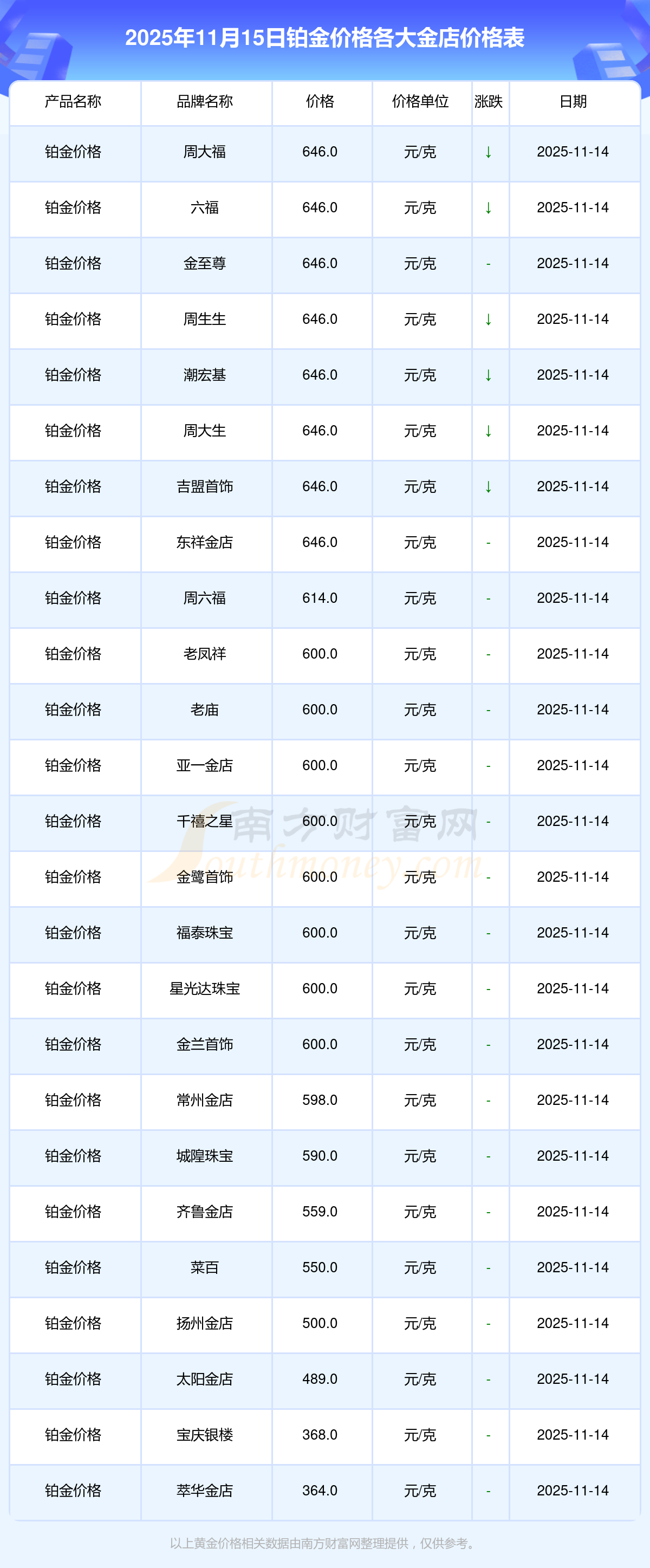 2025年11月15日各金店鉑金價(jià)格最新查詢_今日鉑金價(jià)格最新參考來(lái)了,一起來(lái)看看吧!