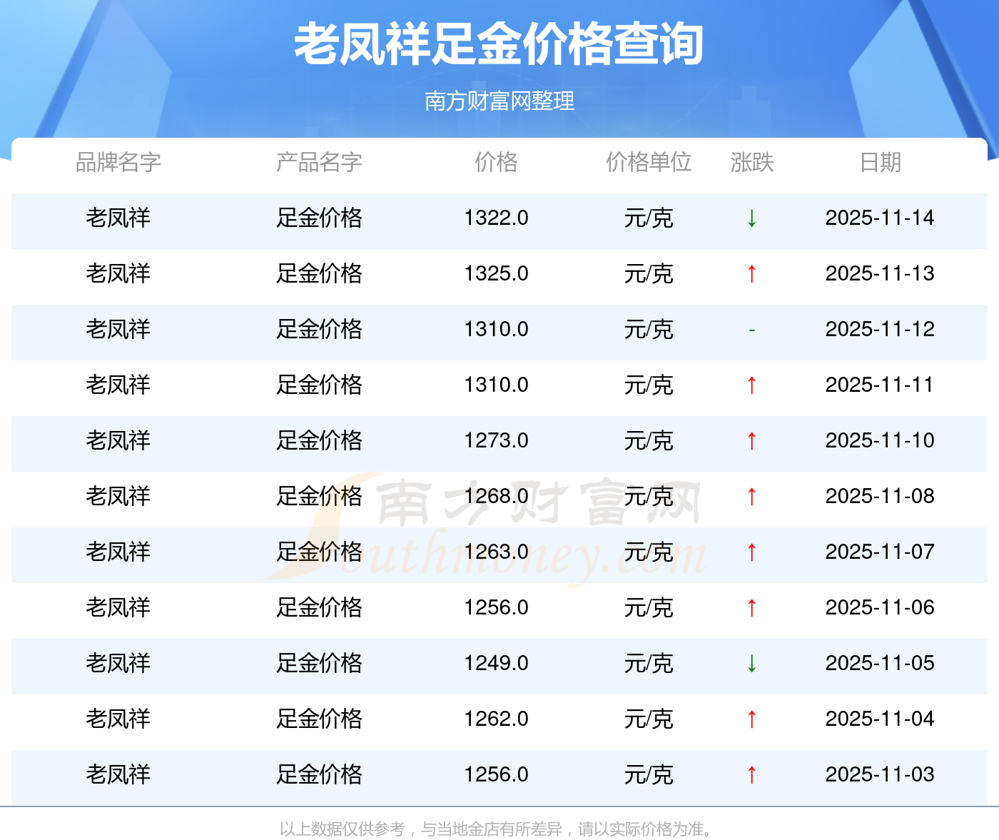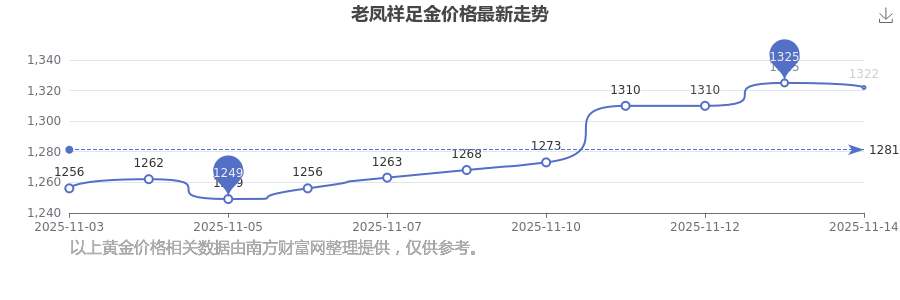 今日老鳳祥所公布的 足金價格最新價格為1322.0元/克。