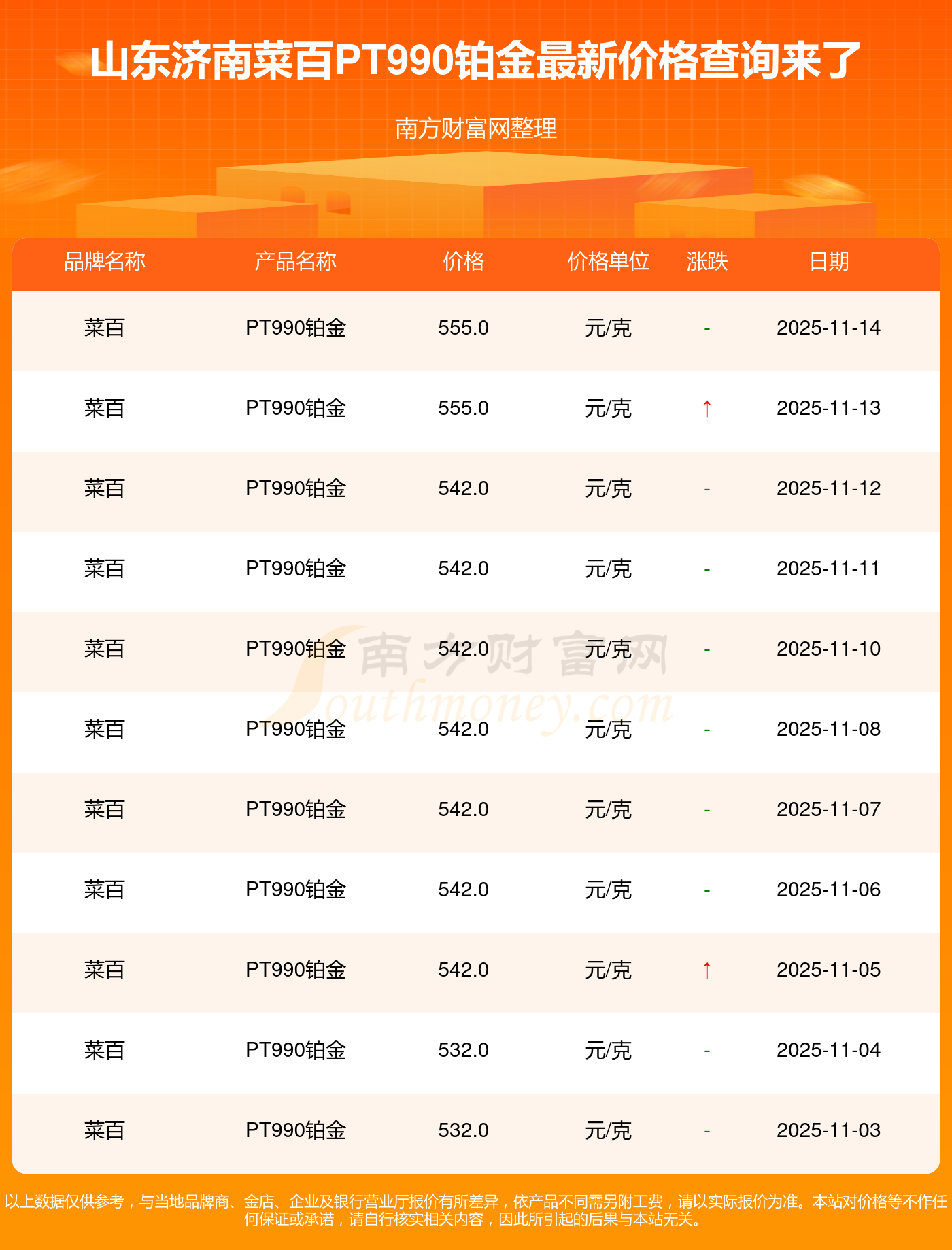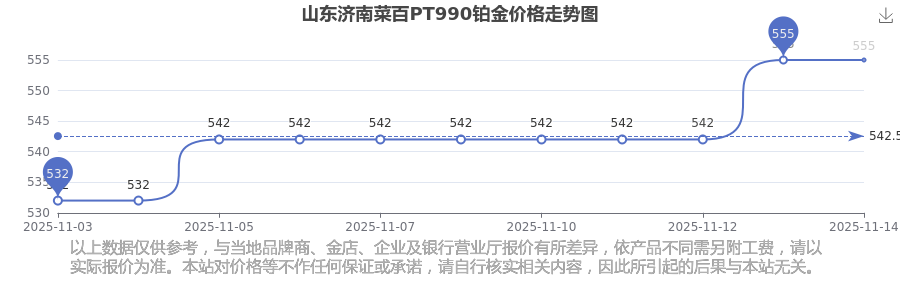 今日(2025年11月15日),山東濟(jì)南菜百PT990鉑金每克的價(jià)值為555.0元/克。