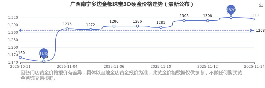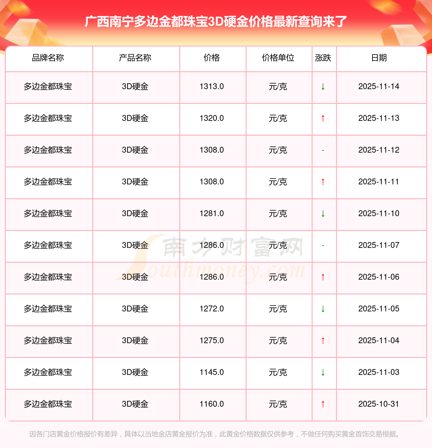 今日(2025年11月15日),廣西南寧多邊金都珠寶3D硬金價格:1313.0元/克。