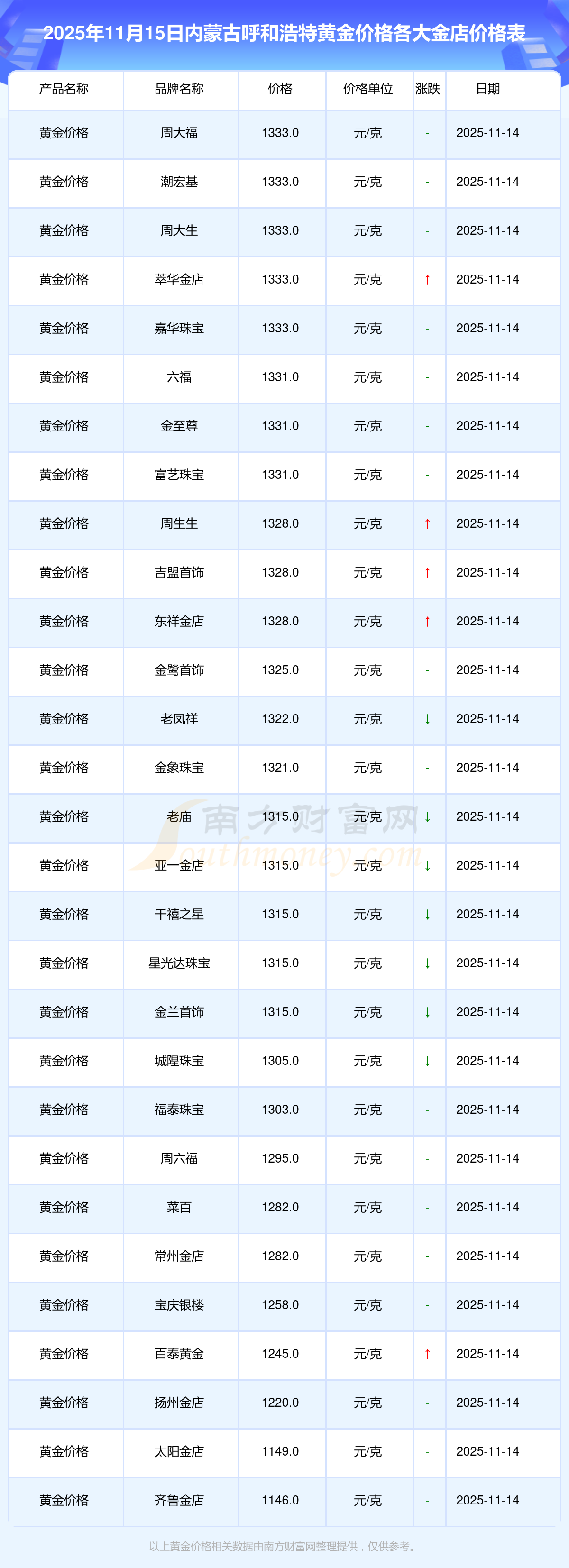 2025年11月15日內(nèi)蒙古呼和浩特各大金店黃金價(jià)格最新價(jià)格:周大福1333.0元/克,周大福646.0元/克,周大福1333.0元/克,周大福46320.0,周大福18410.0,周大福41780.0,周大福1167.0元/克,老鳳祥1322.0元/克,老鳳祥600.0元/克,老鳳祥1322.0元/克,周六福1295.0元/克。