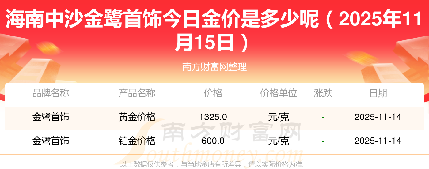 海南中沙金鷺首飾金價(jià)今日價(jià)格最新_海南中沙金鷺首飾黃金多少錢一克2025年11月15日,隨小編來了解一下詳情。
