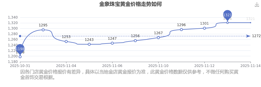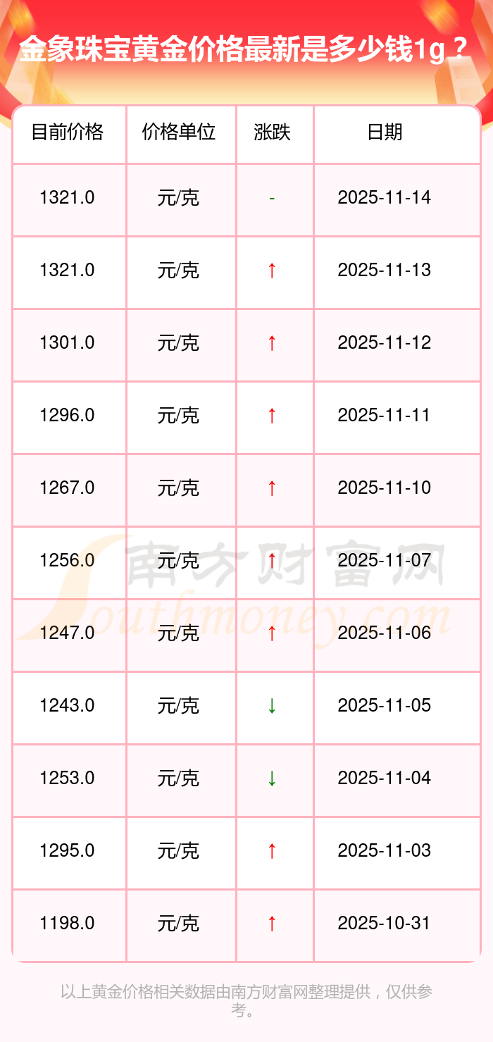 想查詢今日黃金價格,當(dāng)下黃金一克具體售價幾何?黃金是種優(yōu)良的導(dǎo)電導(dǎo)熱材料,具有良好的導(dǎo)熱特性。因其化學(xué)穩(wěn)定性高、抗氧化性強(qiáng),能夠制作高精度電子元件,故而常用于電子工業(yè)中的特殊電路設(shè)計。今日(2025年11月15日),金象珠寶黃金價格最新價格是1321.0元/克。